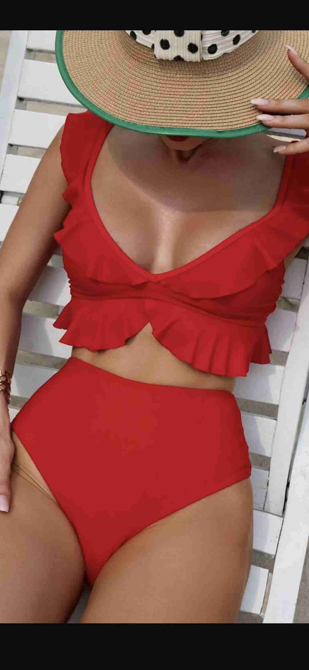 Hermoso bikini rojo con vuelos parte superior NUEVO perfecto para el verano, talla L, calzón tiro alto culotte L . En excelente estado, ideal para la playa o la piscina.