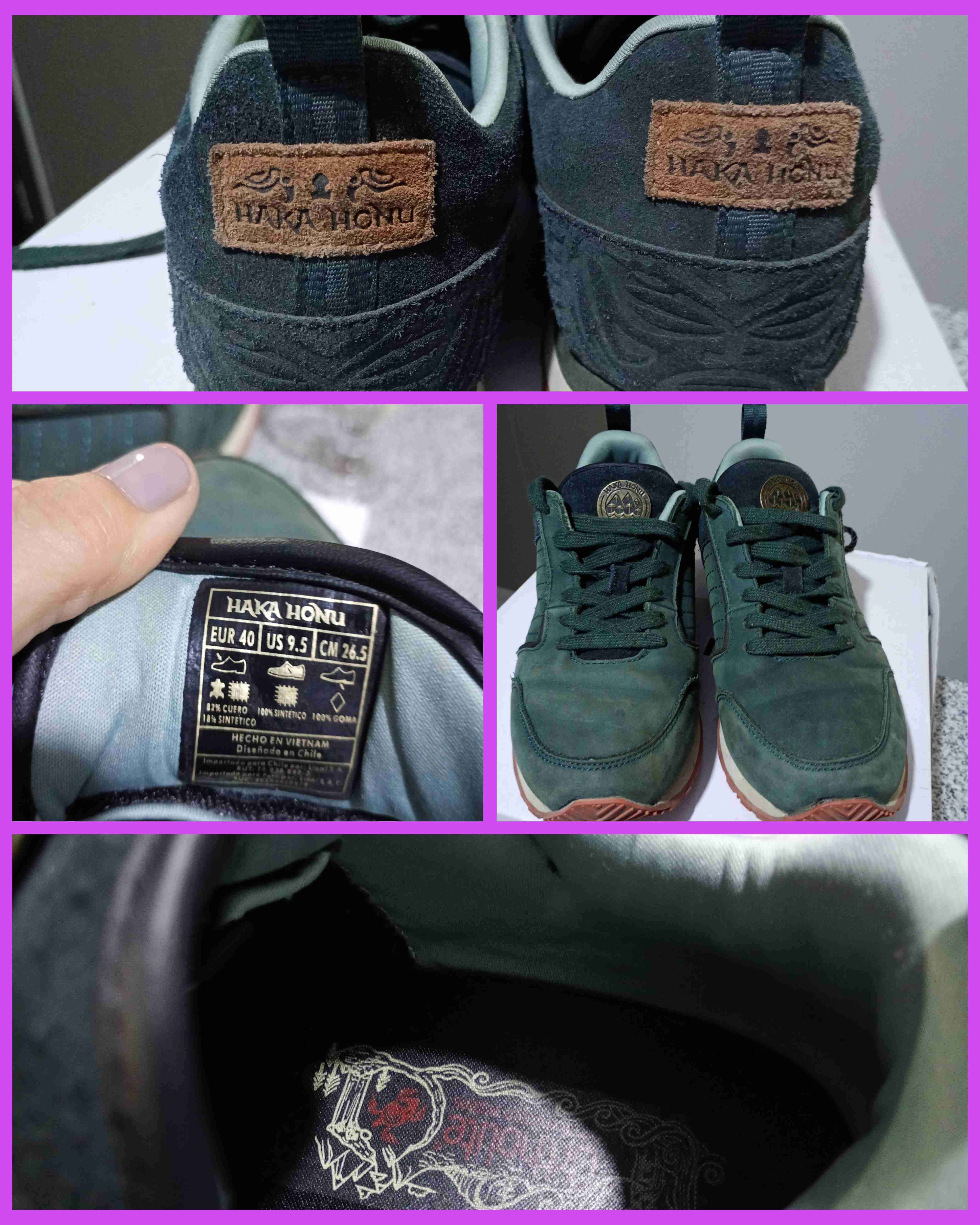 Zapatillas de cuero Haka Honu en buen estado, color verde oscuro. Ideales para el uso diario con estilo único, horma angosta.