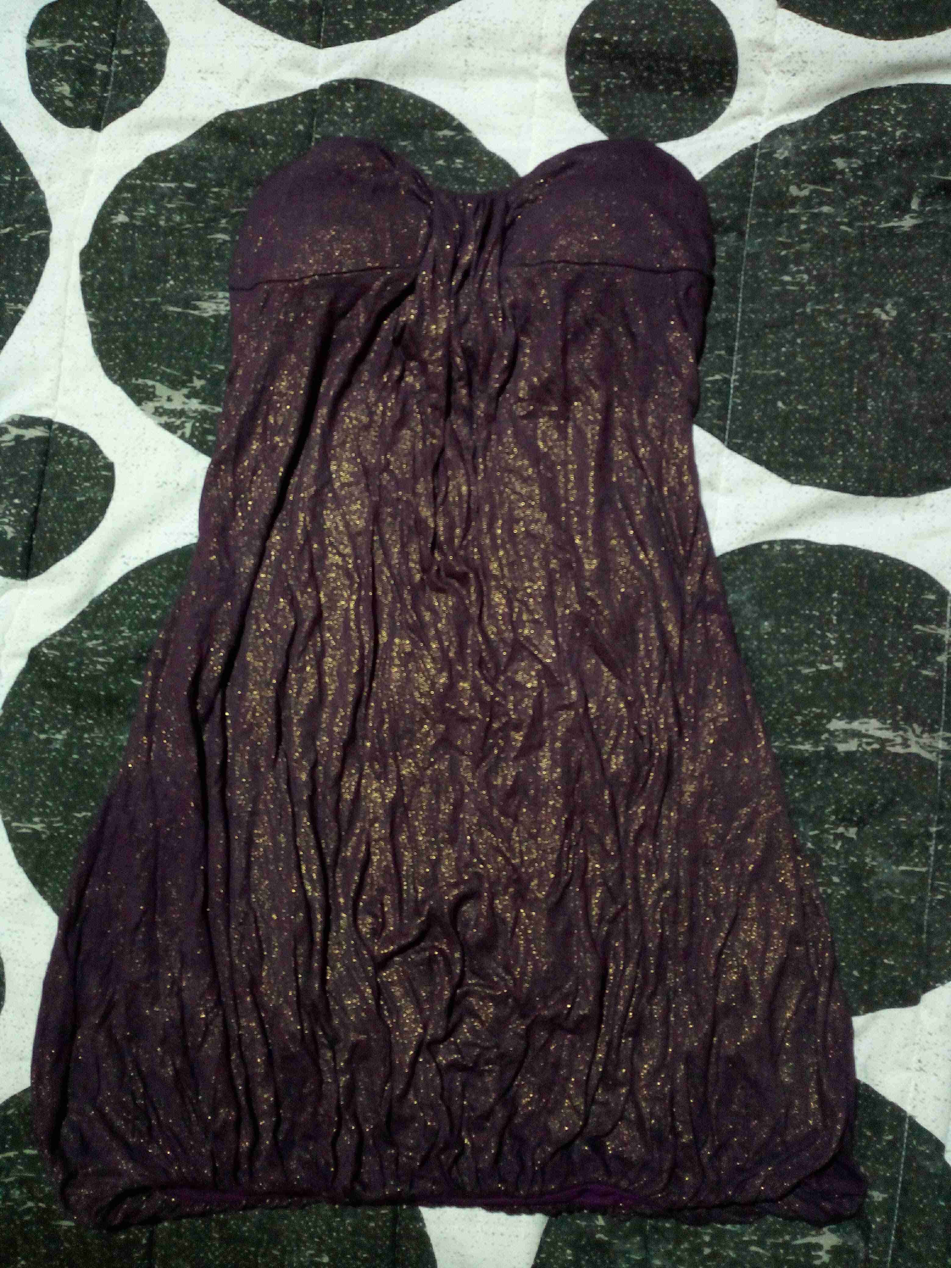 Vestido de fiesta morado con brillo dorado, ideal para ocasiones especiales. Buen estado general.