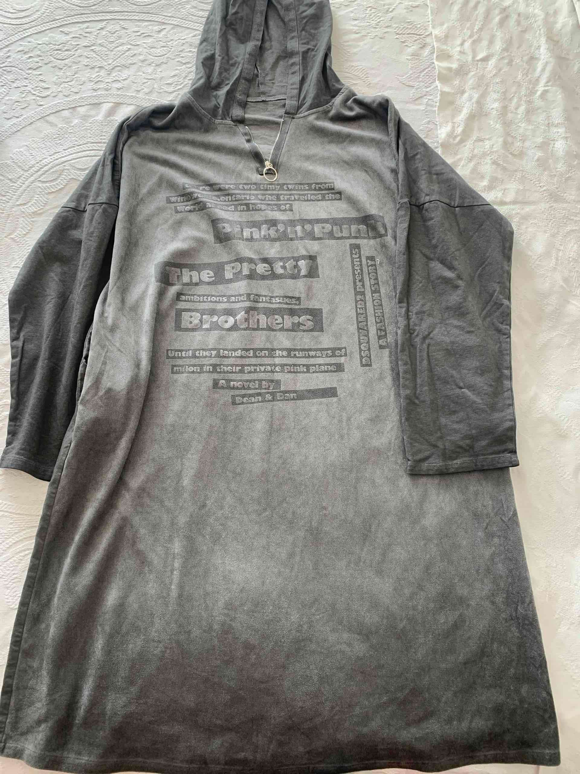 Vestido largo gris con capucha,bolsillos y estampado frontal. Perfecto para un look casual y cómodo. Nuevo Talla XL (grande)