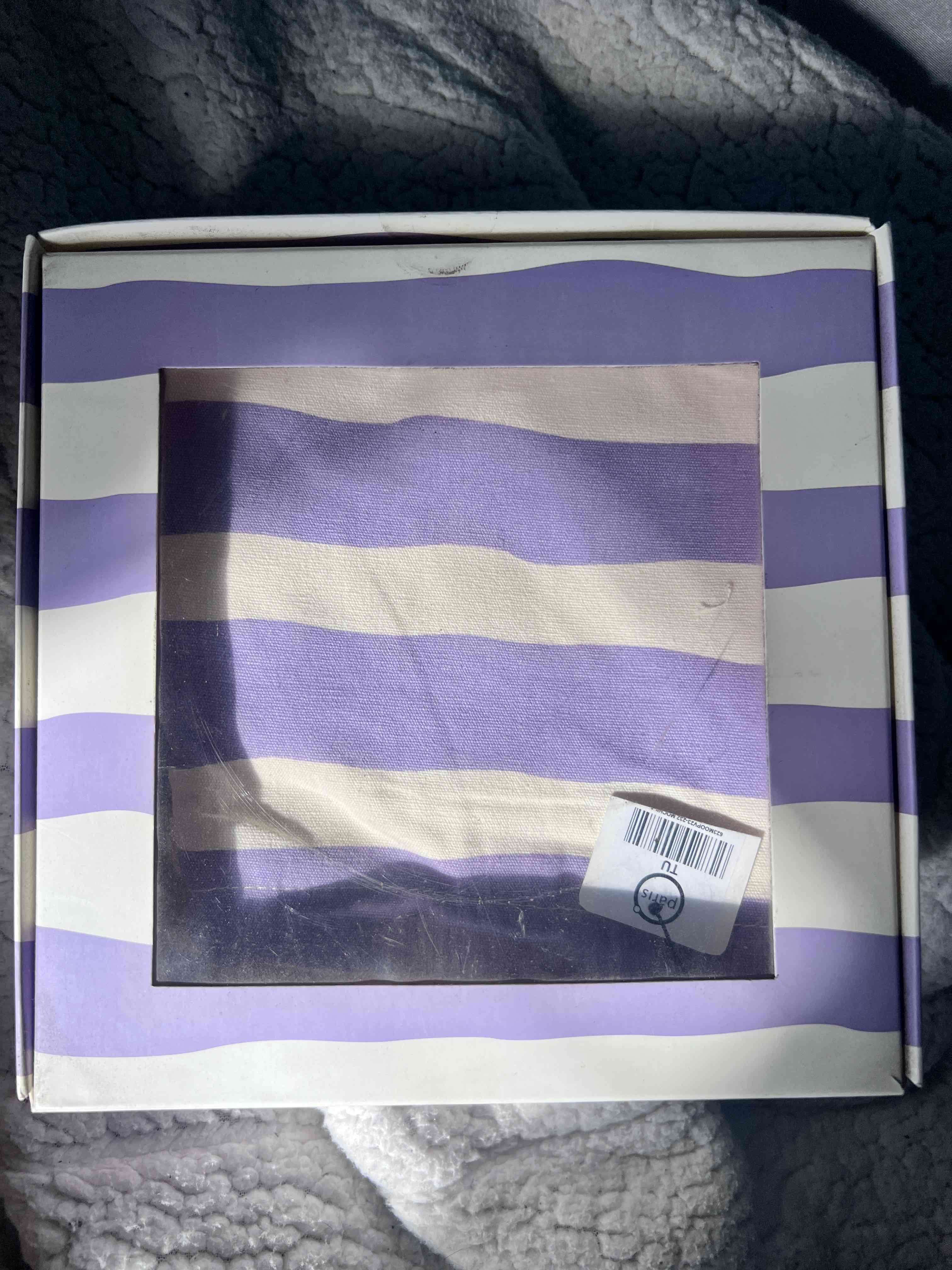 Mochila a rayas moradas y blancas, ideal para complementar tu atuendo junto a porta celular a prueba de agua para sumergir. Completamente nuevo, dentro de caja original.