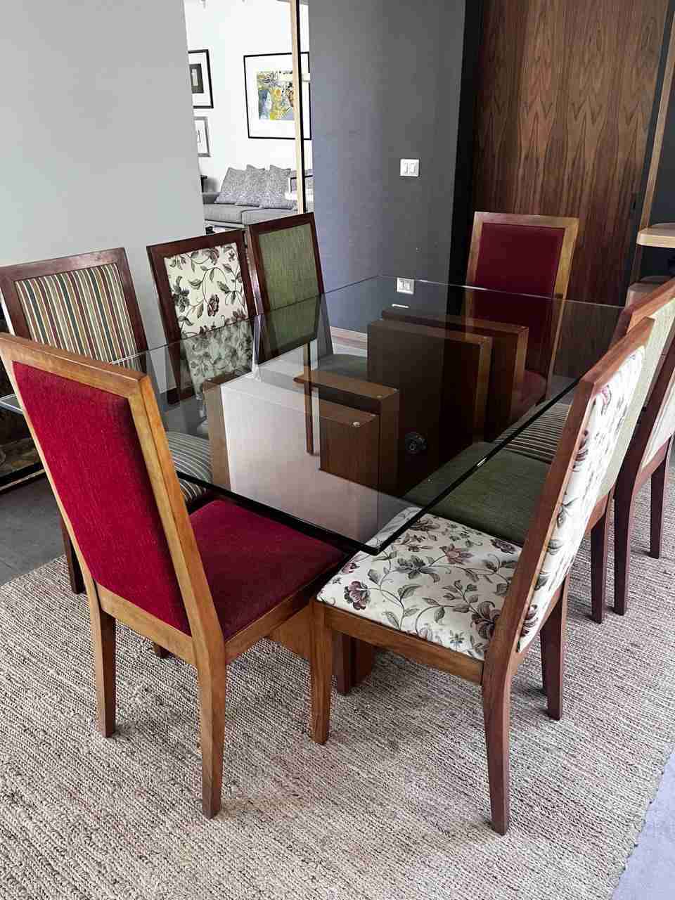 Juego de comedor con mesa de vidrio y sillas tapizadas de colores variados. Ideal para ocho personas, en perfecto estado. Precio conversable Vendo comedor completo 1,70 x 1,10 cm. Cristal muy grueso de 1,5cm Mesa y 8 sillas El conjunto está muy bien cuidado. Nota importante: 3 de las sillas están algo sueltas y requieren un ajuste sencillo de carpintería para quedar al 100%. El resto está impecable. Retiro: Lo Barnechea Consulte por Facebook messenger o al +56988875652
