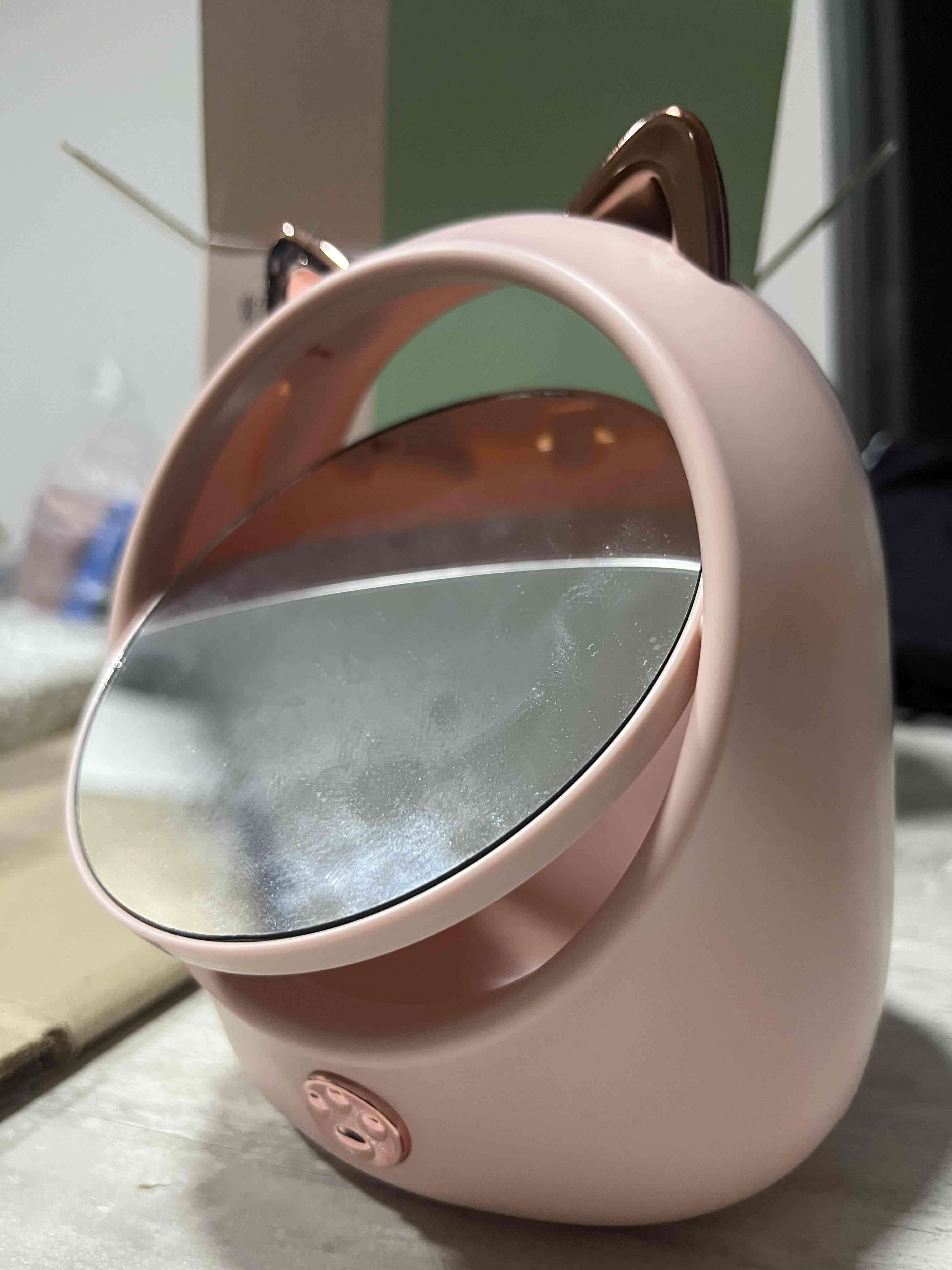 Espejo de tocador con luz LED, diseño de orejas de gato, ideal para maquillaje. Buen estado, con leves signos de uso.