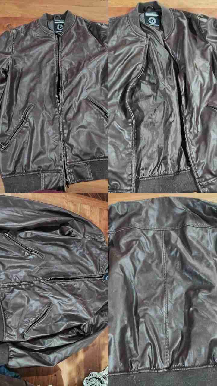Chaqueta estilo bomber de cuero sintético en color marrón, ideal para días frescos. En buen estado general, con cierre y bolsillos funcionales. Entrega a cualquier metro a convenir