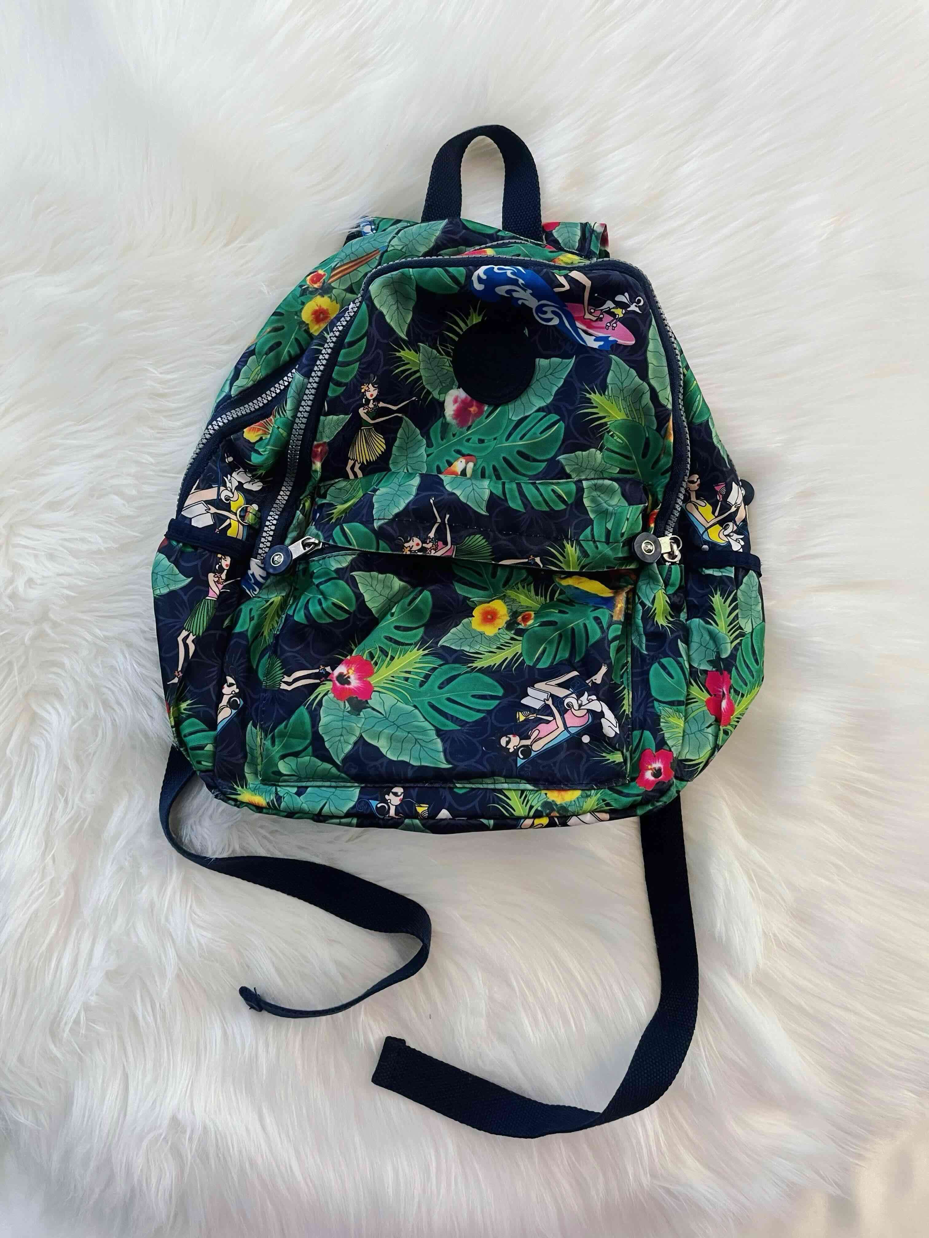 Mochila con diseño tropical y colorido. En buen estado general, ideal para el uso diario o viajes cortos.