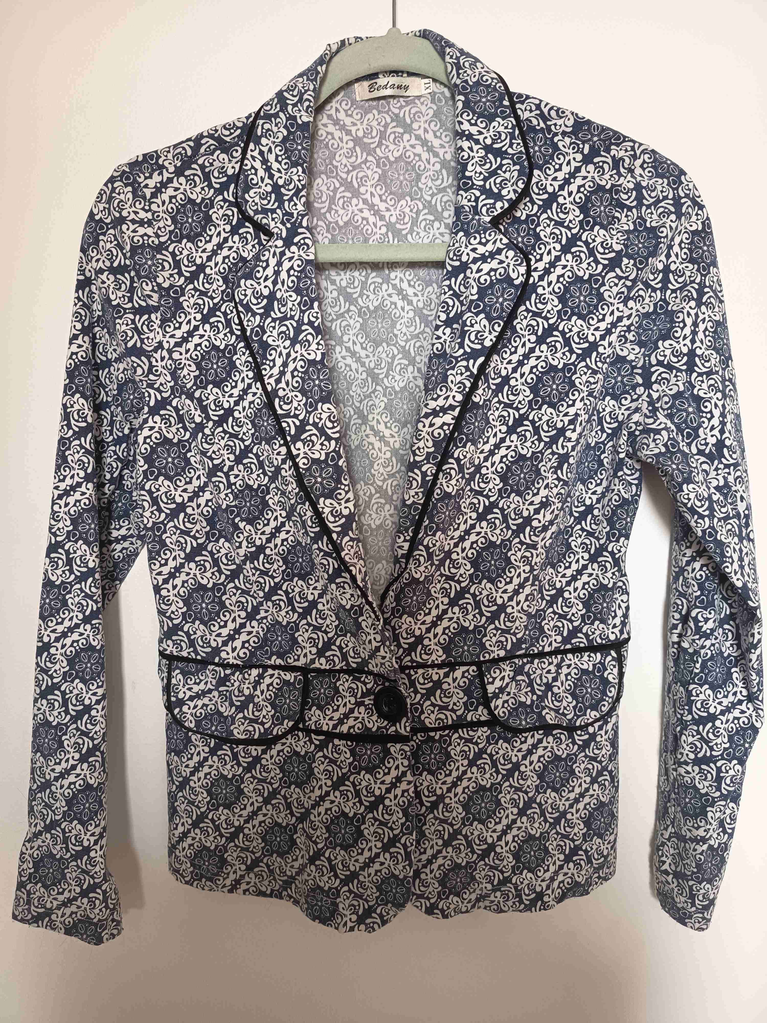 Blazer elegante azul con diseño estampado, perfecto para ocasiones formales o estilo casual chic. En buen estado general.