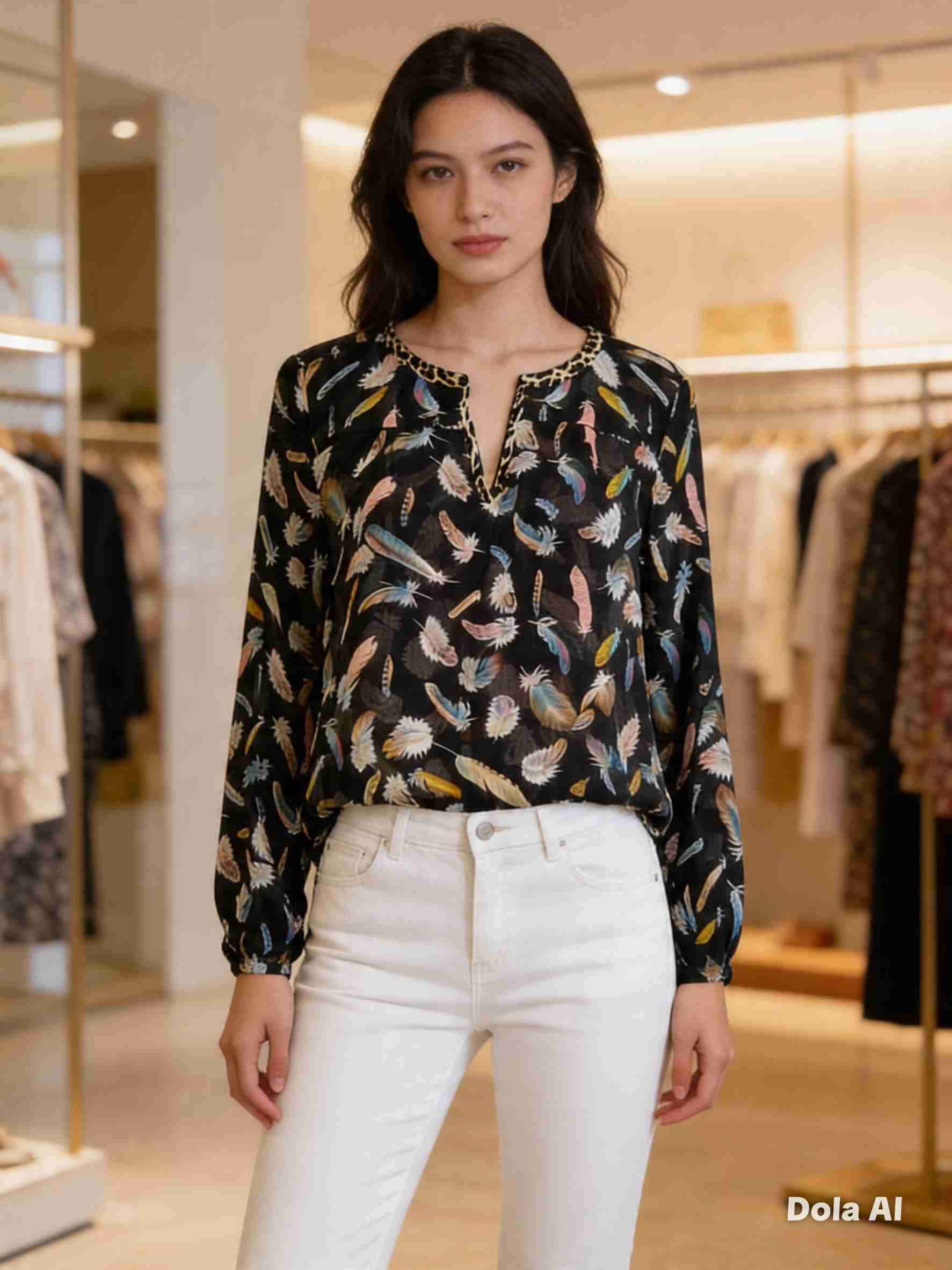 Blusa de mujer con estampado de plumas, ideal para ocasiones casuales. Buen estado general.