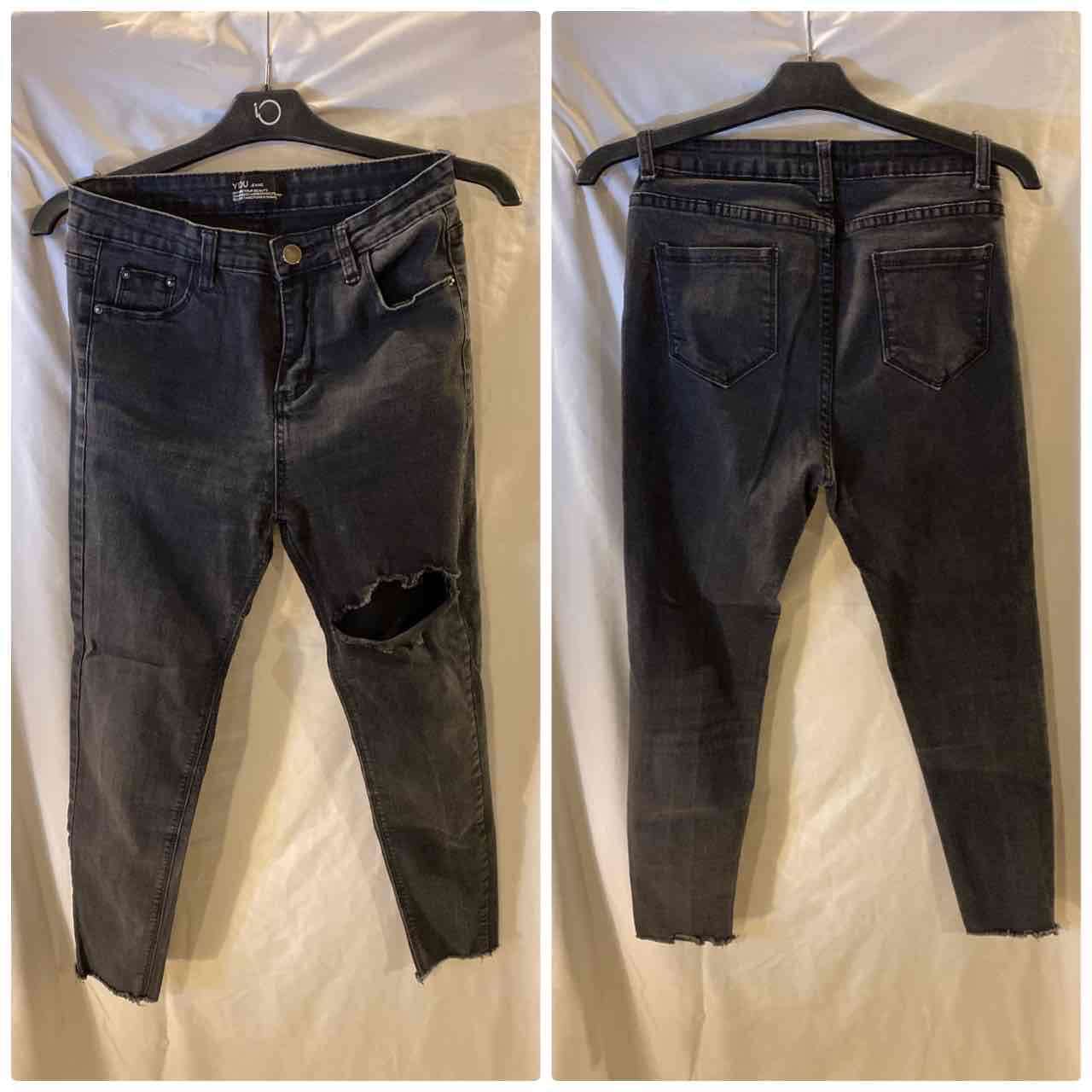 Jeans negros estilo desgastado con rotura en la rodilla. Ideal para un look casual. En buen estado general.