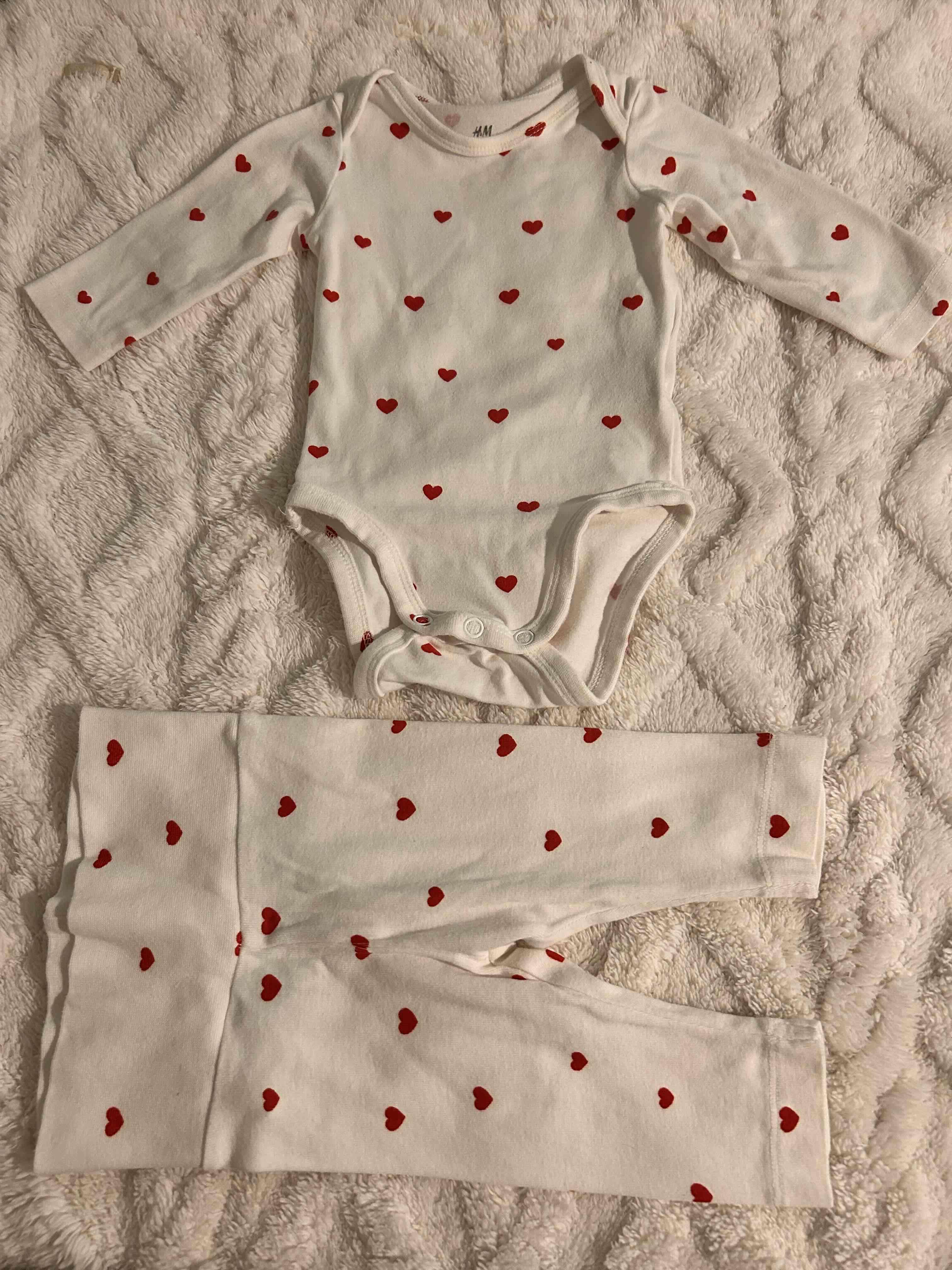 Conjunto para bebé con estampado de corazones rojos. Ideal para uso diario, en buen estado.