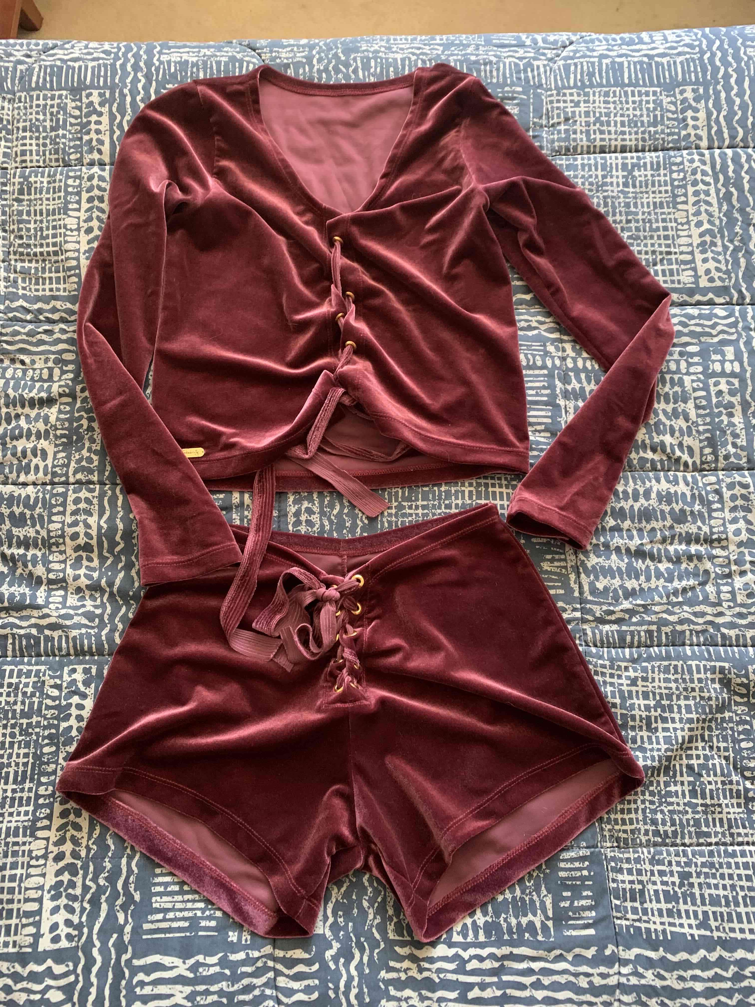 Conjunto de terciopelo en color burdeos, ideal para ocasiones informales. En buen estado, suave y cómodo.