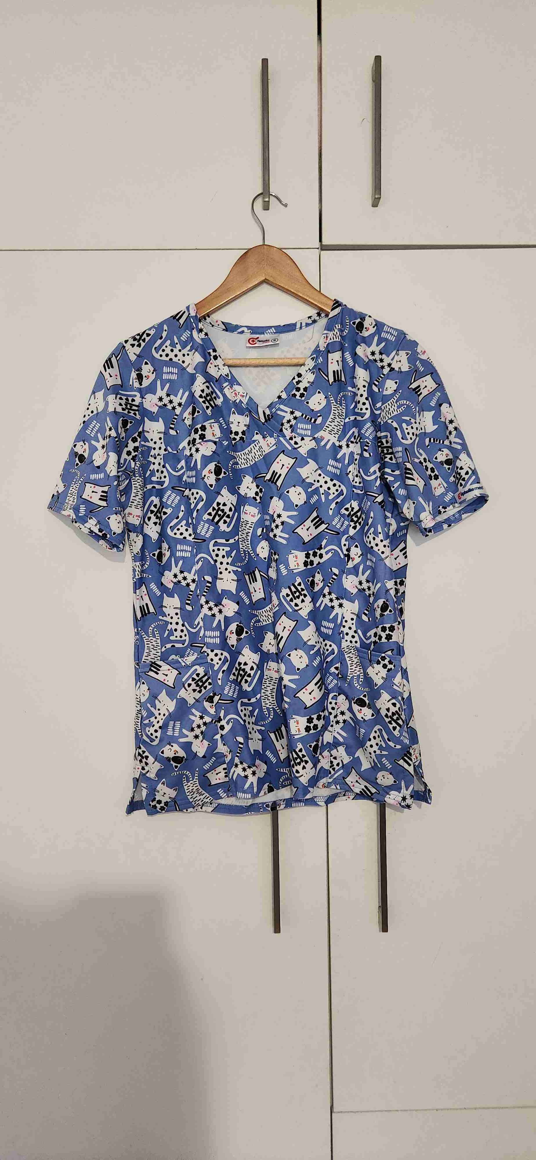 Polera clínica de mujer con estampado de gatos coloridos en fondo azul. Ideal para un look casual y cómodo.