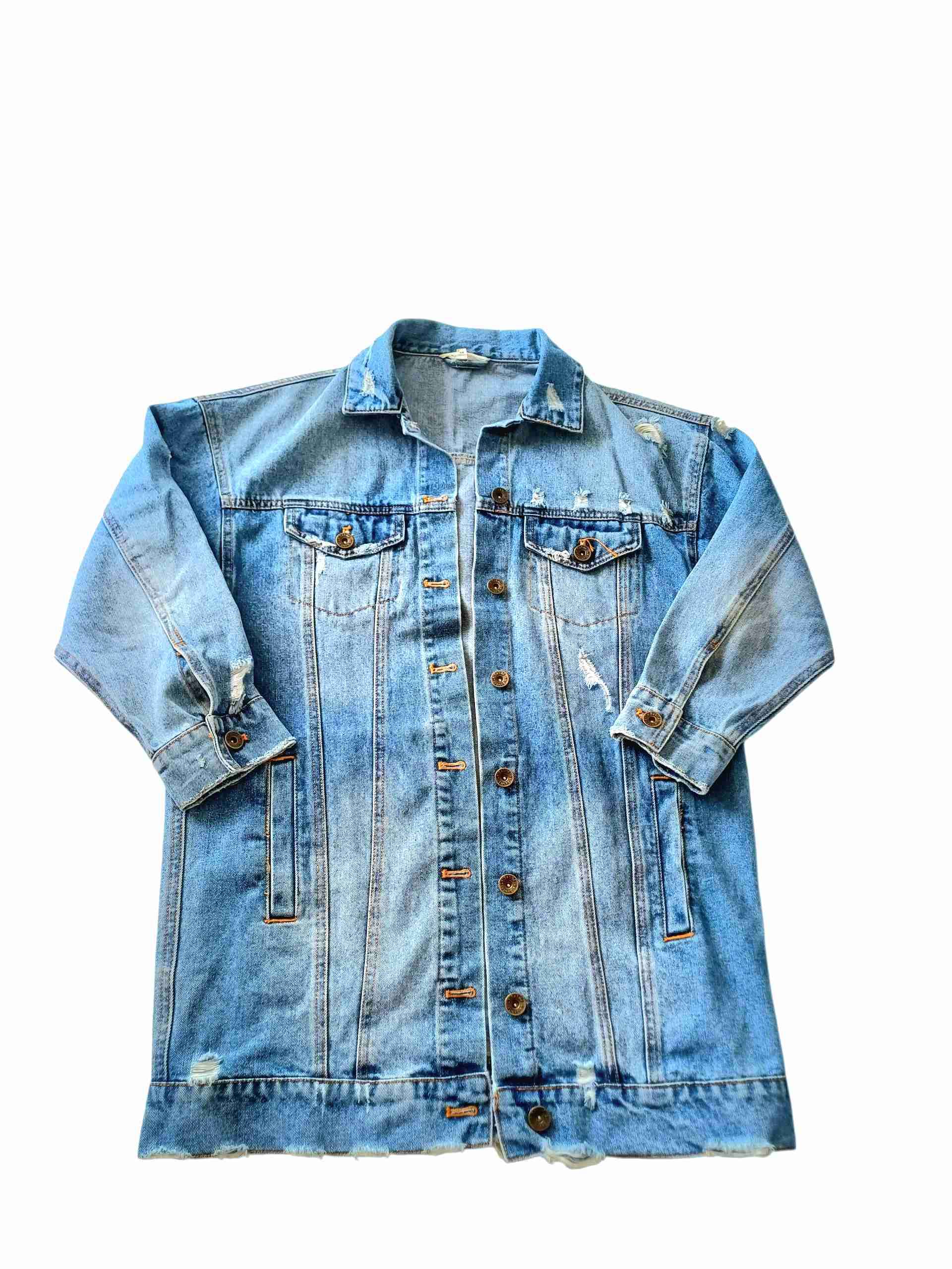 Chaqueta de mezclilla azul con estilo desgastado. Perfecta para un look casual. Las mangas son 3/4 y es larga llega a la cadera.En buen estado.