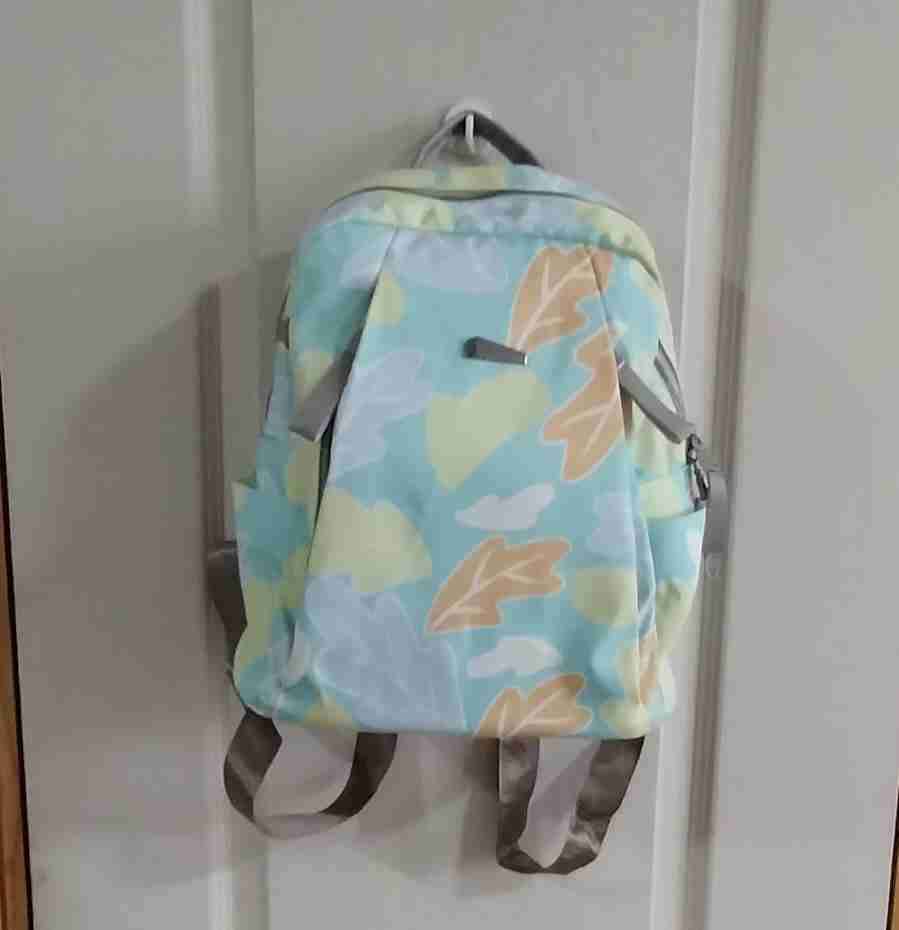 Mochila pequeña con diseño de hojas en tonos pastel, ideal para uso casual. Buen estado con signos leves de uso.