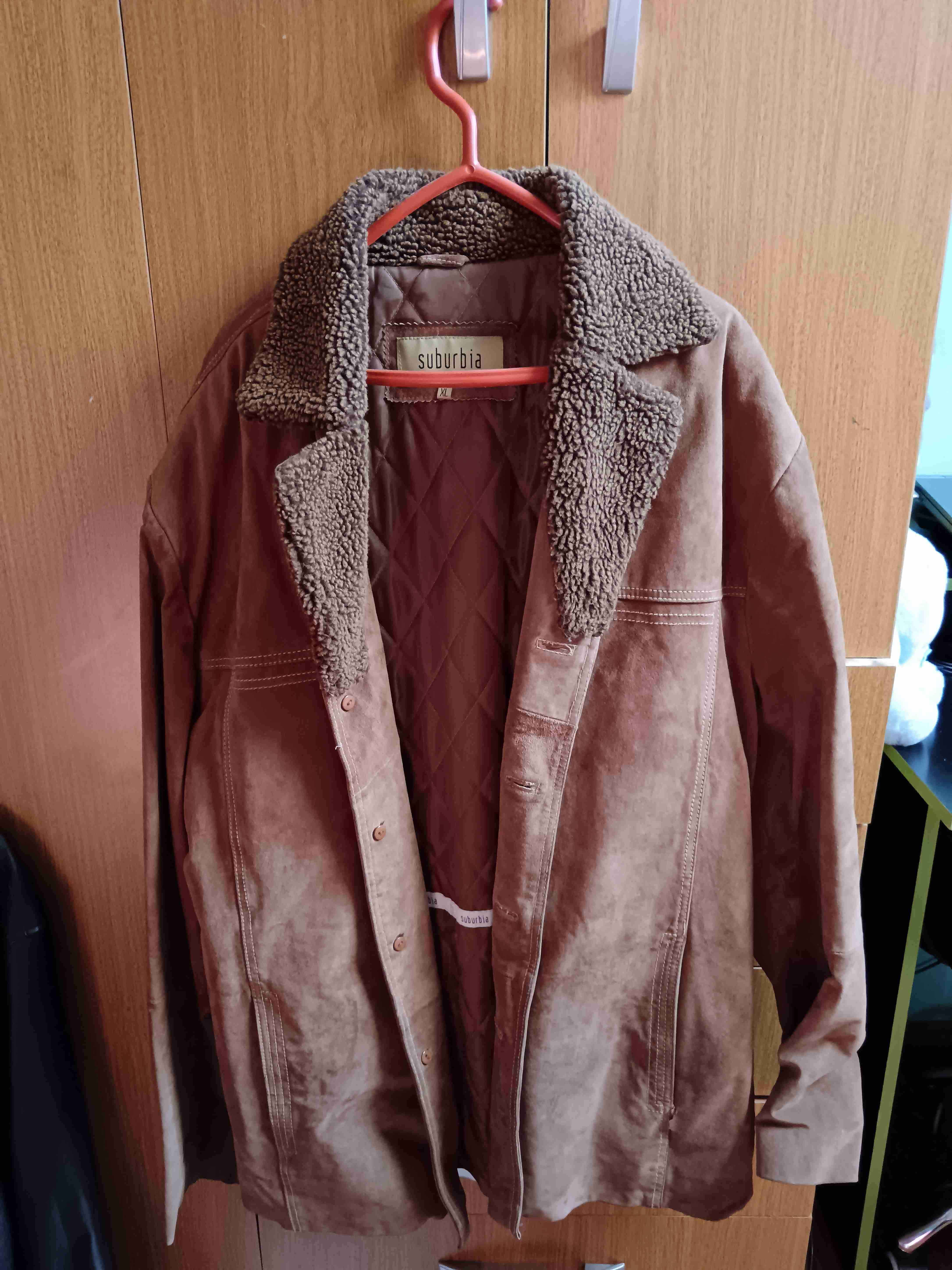 Abrigo de gamuza marrón con forro de peluche, ideal para invierno. En buen estado general. Pequeño detalle estético en el bolsillo izquierdo pero no afecta en su función.