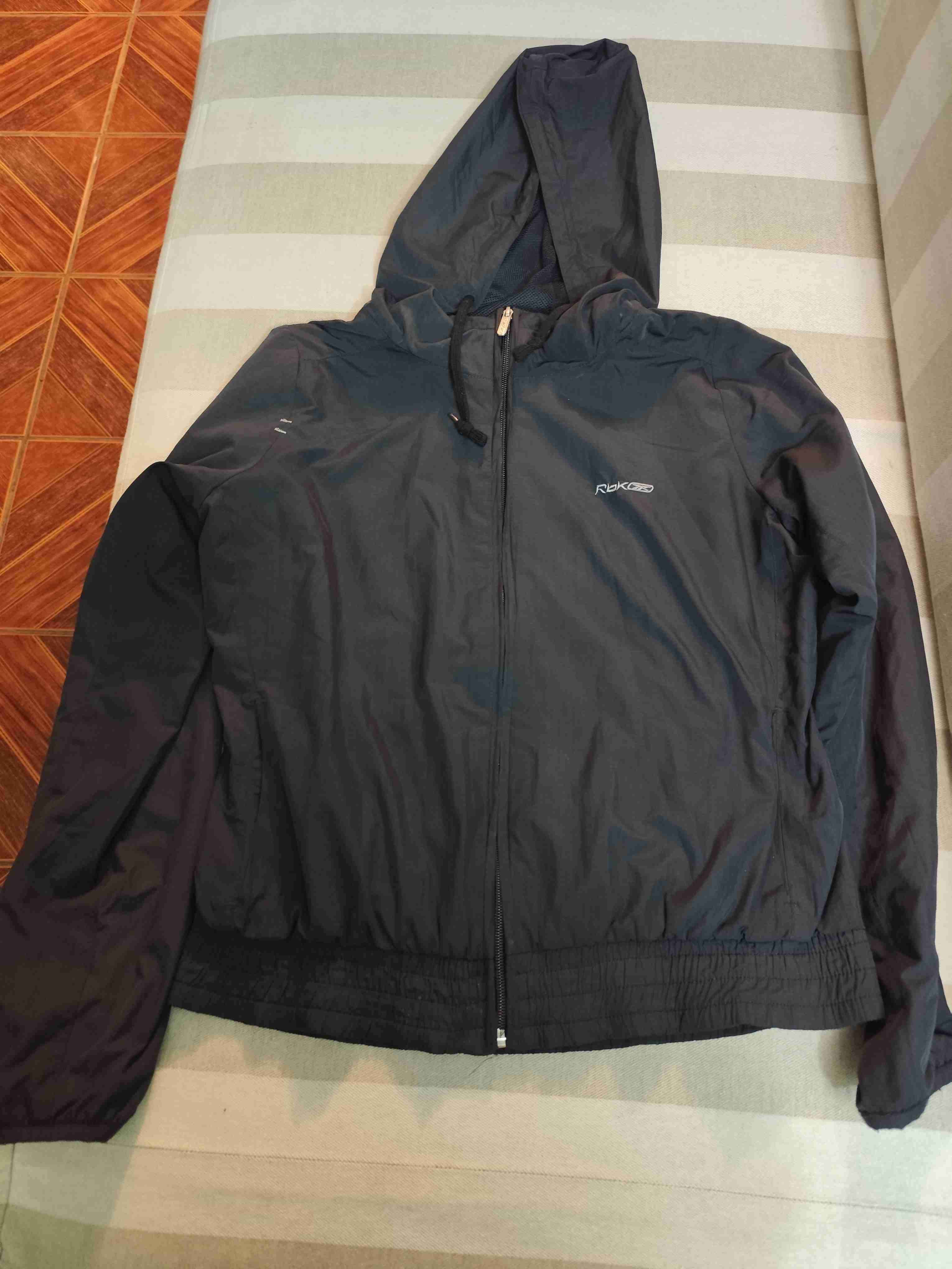 Chaqueta azul con capucha, ideal para días fríos. En buen estado general, con leves signos de uso.