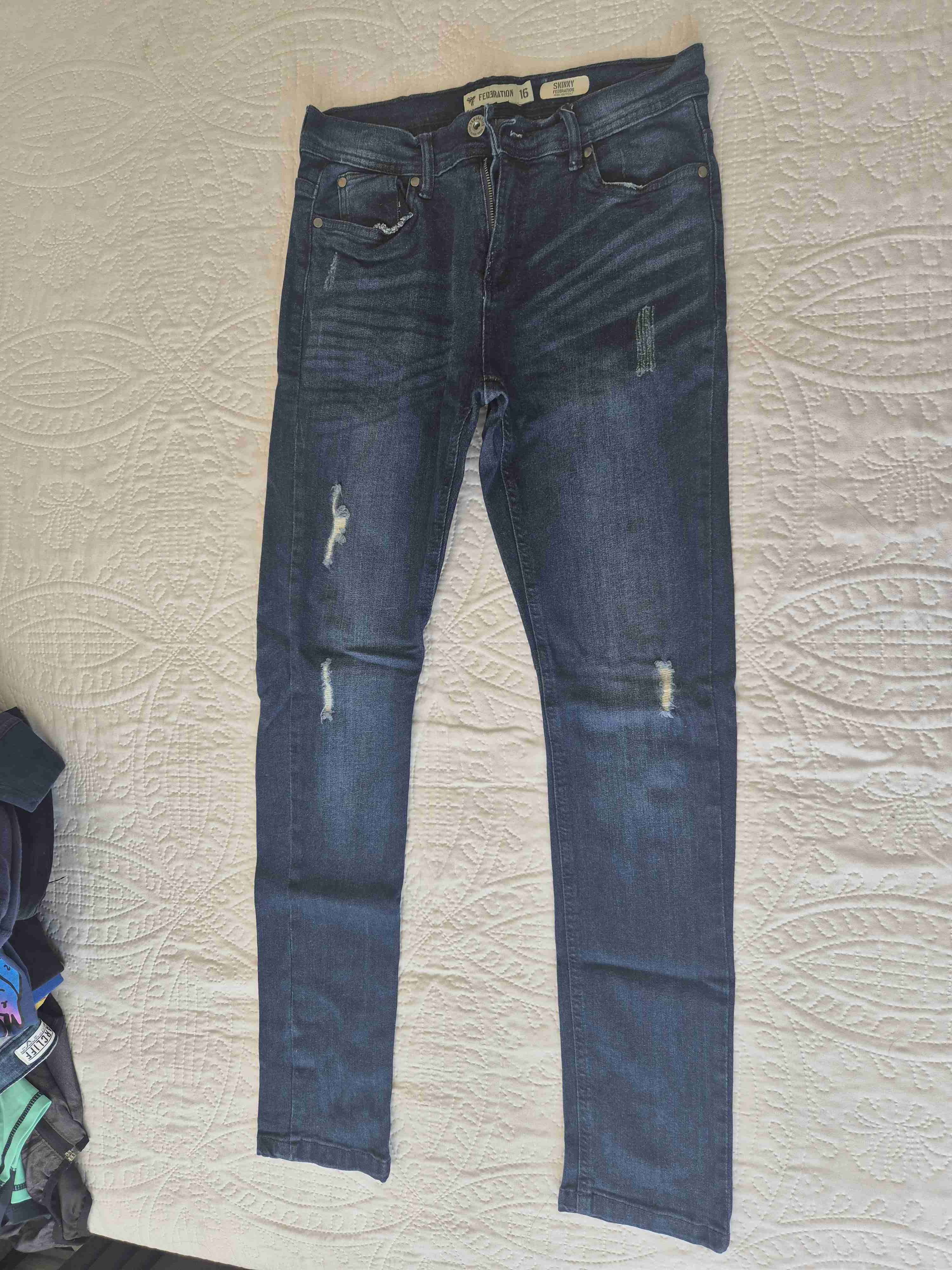 Jeans azul con efecto desgastado y detalles rasgados. Ideal para un look casual y moderno. Marca Federation (Falabella) Talla 16 Skinny. Nuevo, solo se le sacó etiqueta, sin uso.
