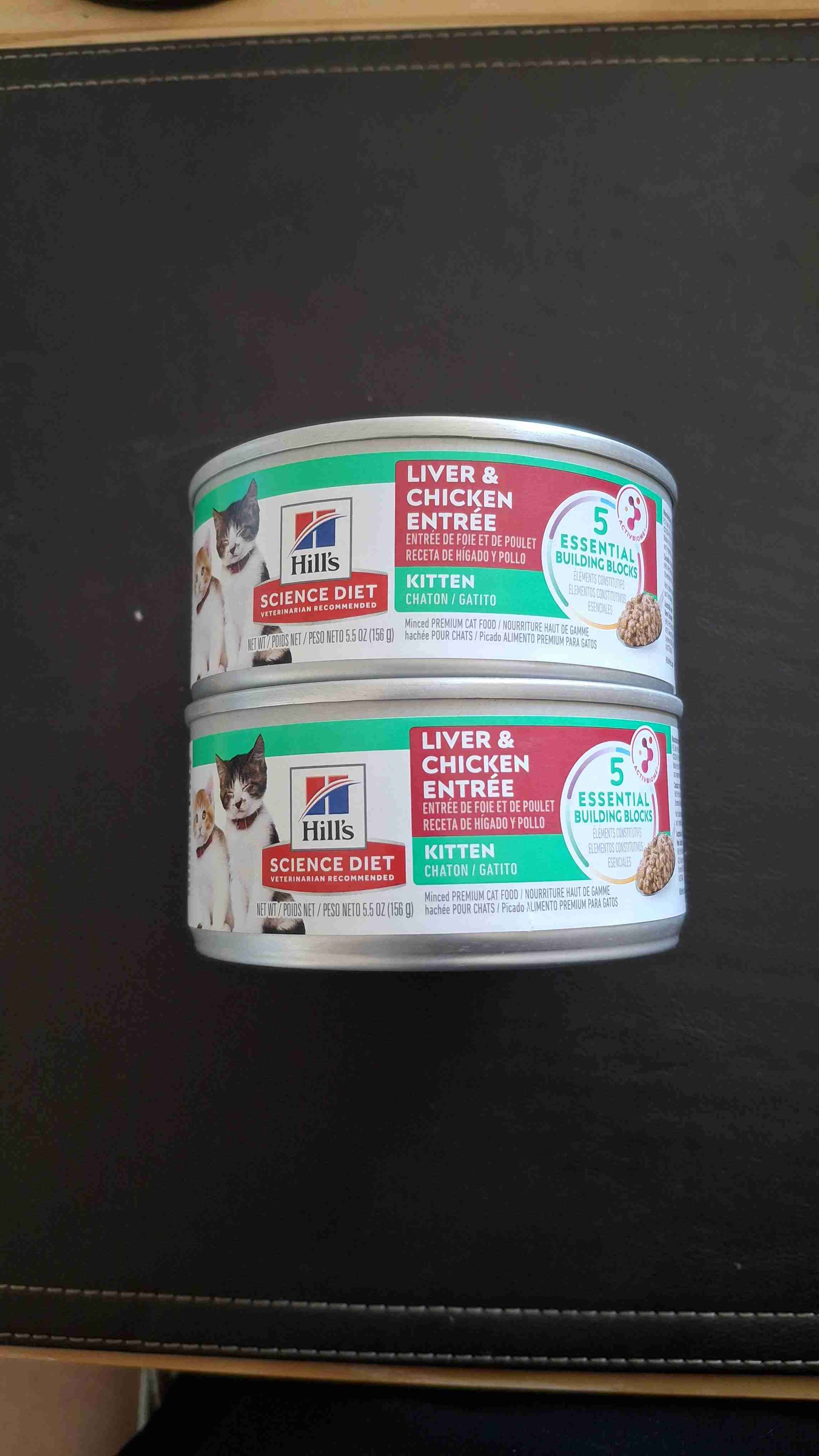 Conjunto de 2 latas Hills Kitten Science Diet Liver & Chicken Entrée. Mis gatitos ya comen croquetas y nos quedaron estas dos latitas de comida. 🤗