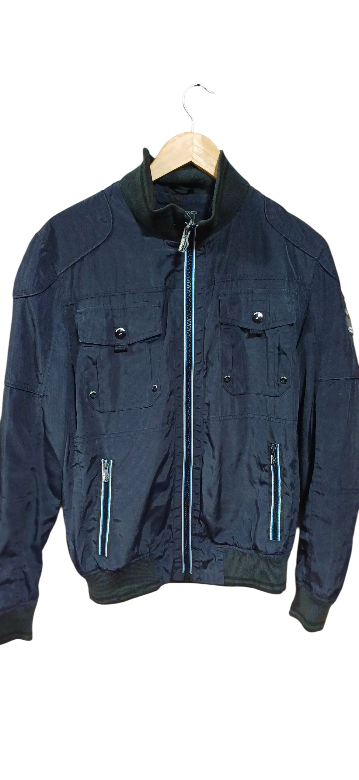 Chaqueta azul oscuro con cierre frontal y bolsillos. Perfecta para días frescos. Marca : Angelo Litrico