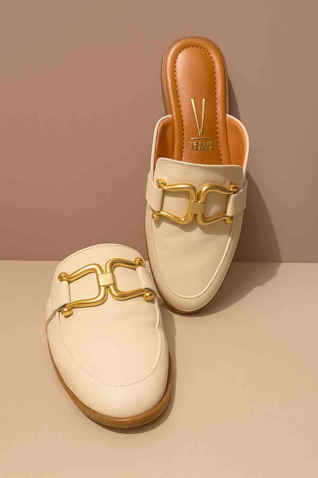 Elegantes zapatos mule color beige con hebilla dorada, en buen estado. Ideales para un look casual y sofisticado.
