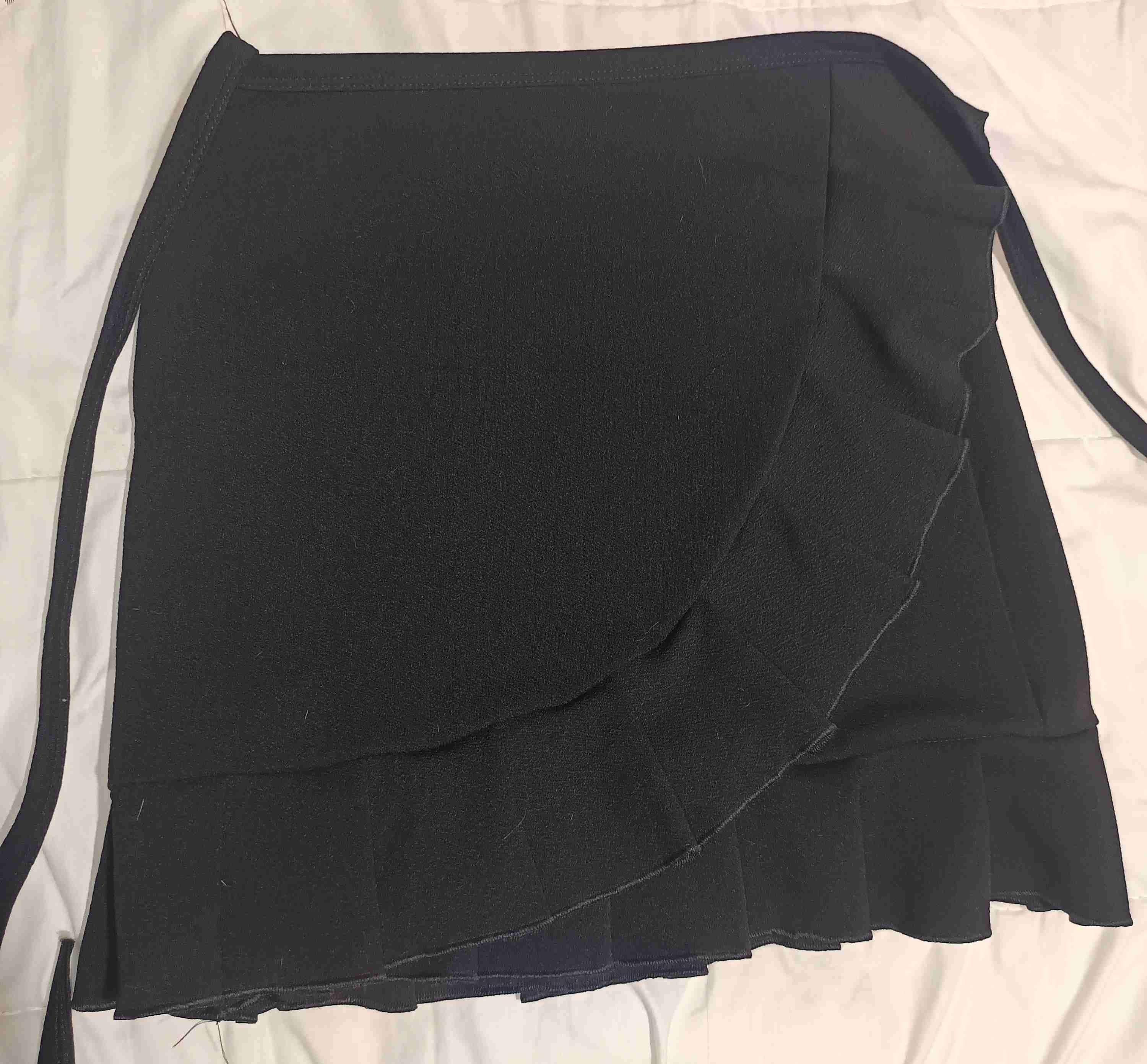 Falda corta negra con volantes, ideal para un look casual. Buen estado general con signos leves de uso. Es como un tipo pareo tiene un solo uso