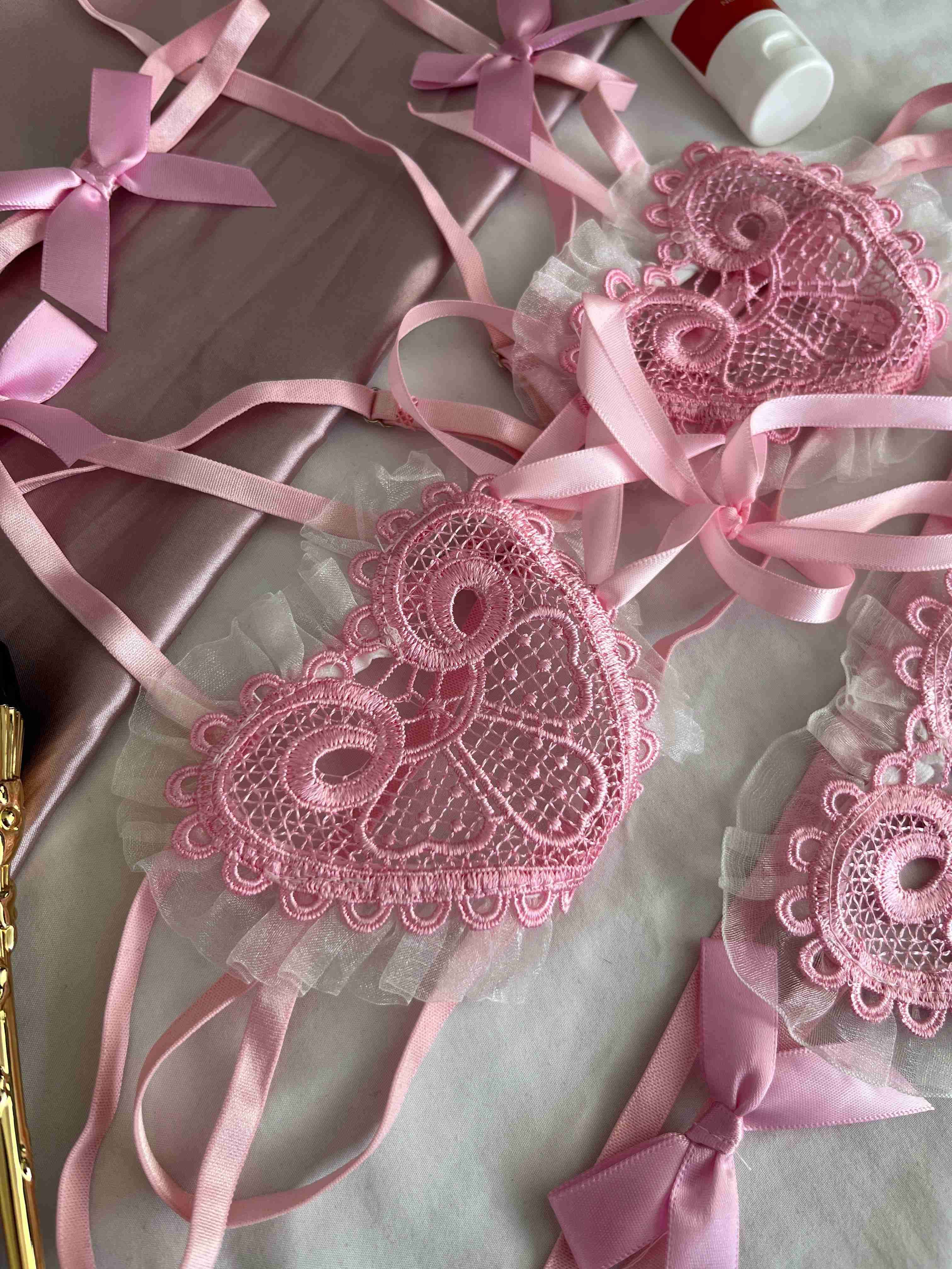 Conjunto de lencería rosado con encaje detallado. Ideal para ocasiones especiales, de aspecto delicado y elegante.