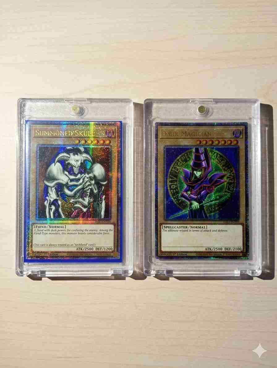 Dos cartas coleccionables Yu-Gi-Oh! en perfectas condiciones, ideales para fans y coleccionistas. Dark magician ra03 quarter Century secret rare summoned skull ra03 quarter Century secret rare