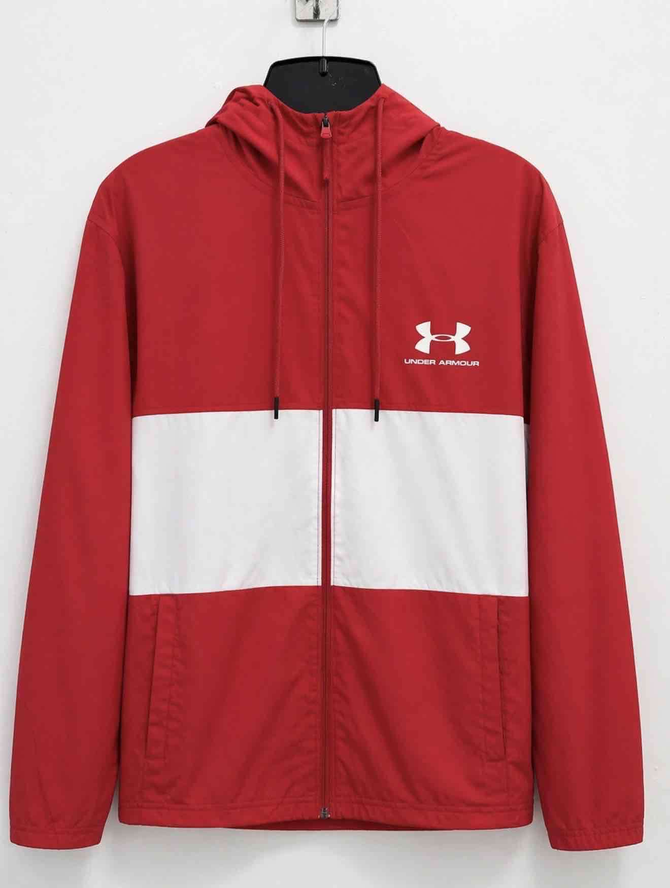 Cortaviento rojo con detalle blanco, ideal para deportes al aire libre. Buen estado, estilo moderno.
