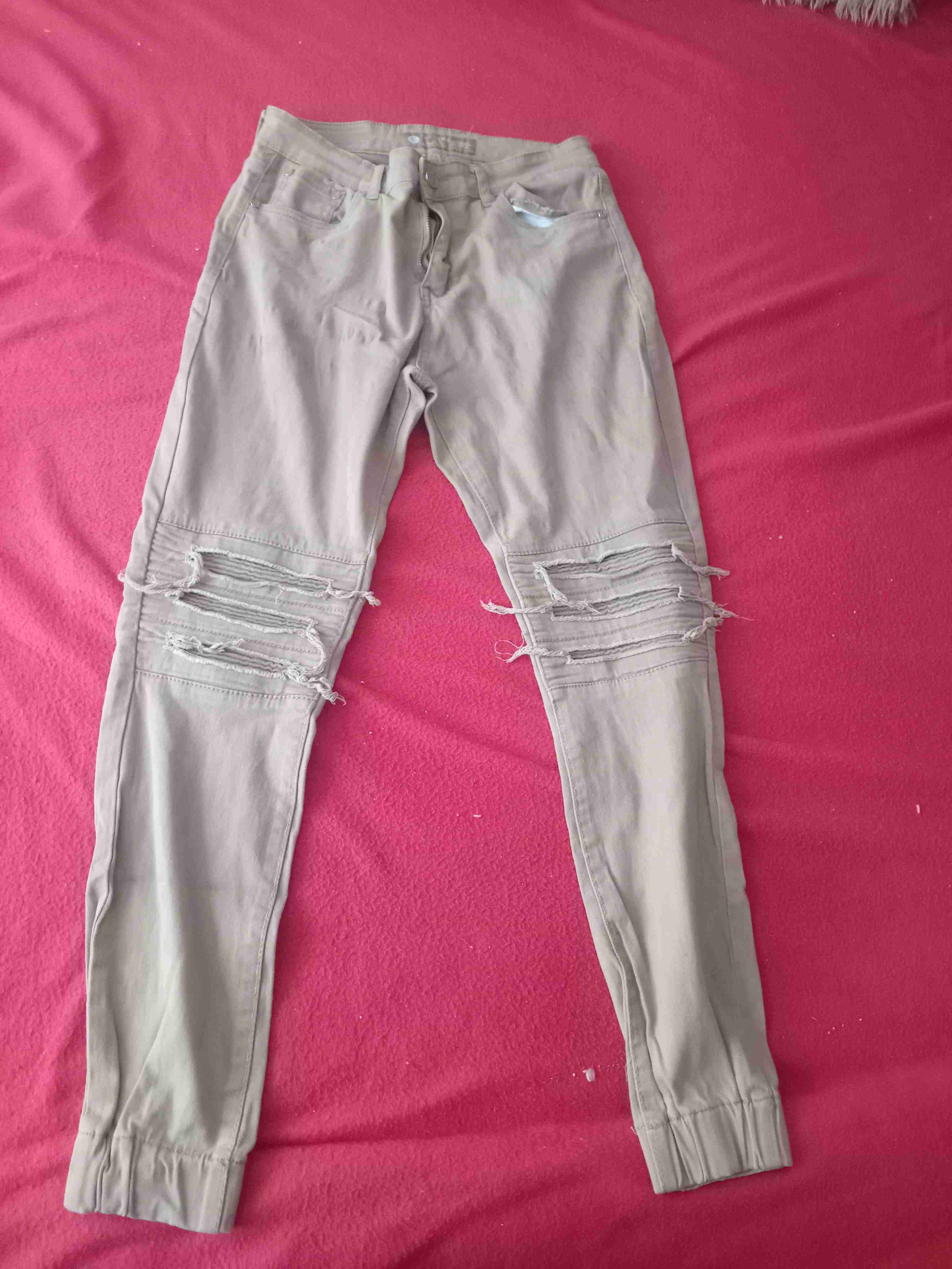 Pantalones beige con estilo rasgado en las rodillas, perfectos para un look casual. En buen estado, con uso visible.