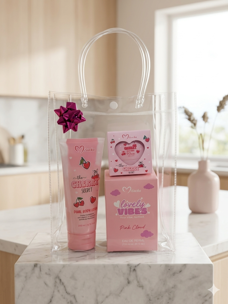 Set de cuidado personal con aroma a cereza. Incluye loción corporal y perfume. Nuevo, ideal para regalo.