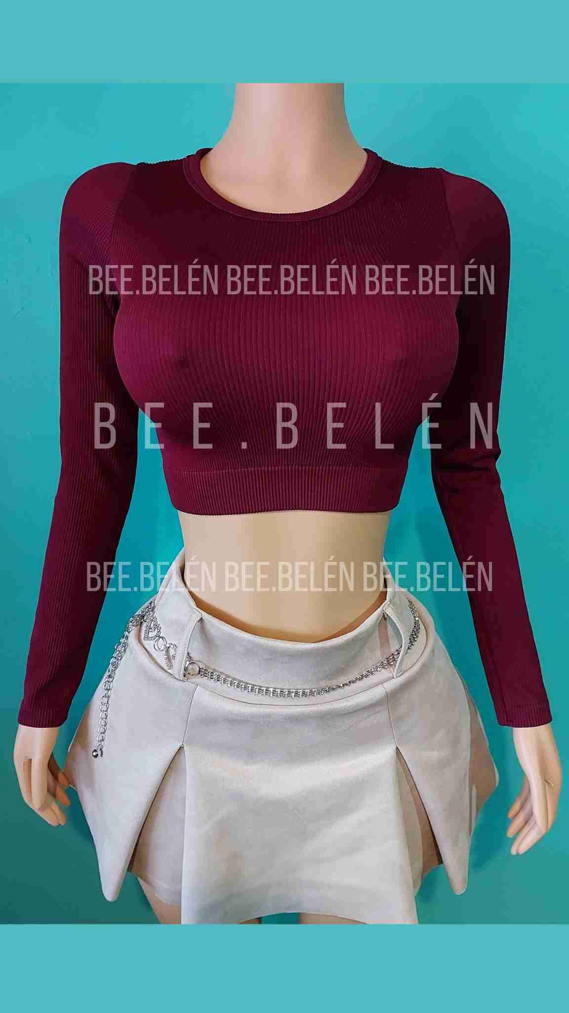 Crop top de manga larga color burdeos, ideal para un look casual y moderno. Tela rib, nuevo, talla estandar que abarca xs s m
