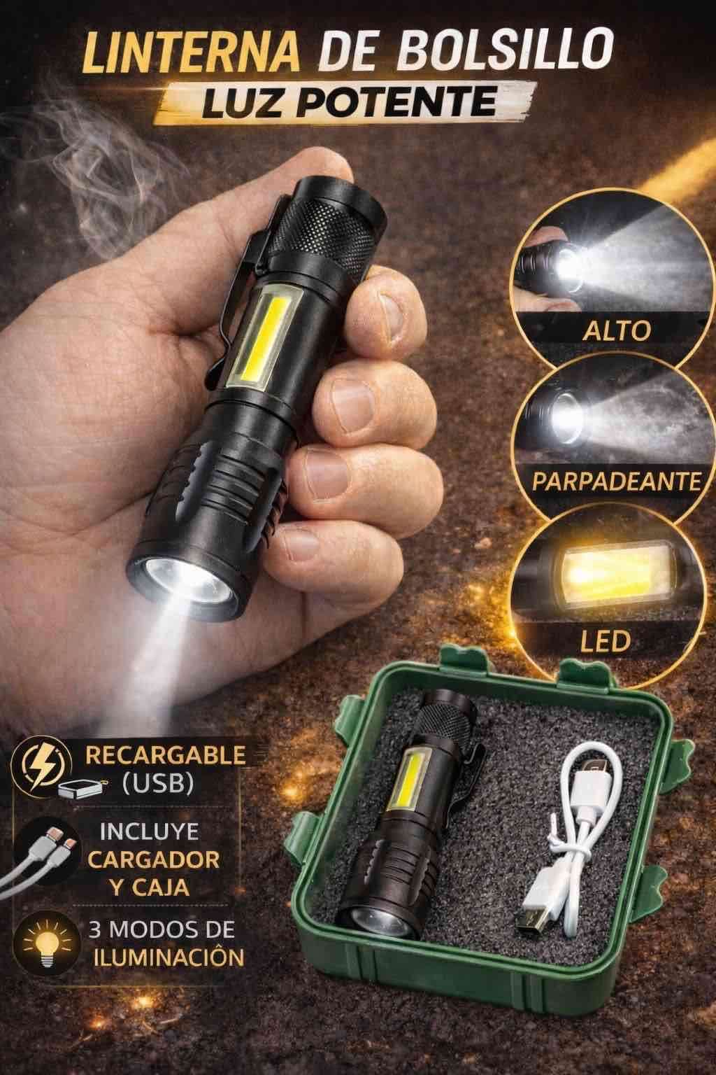 Linterna recargable con luz LED y 3 modos de uso. Incluye cargador y caja de transporte. Ideal para campamentos o emergencias.