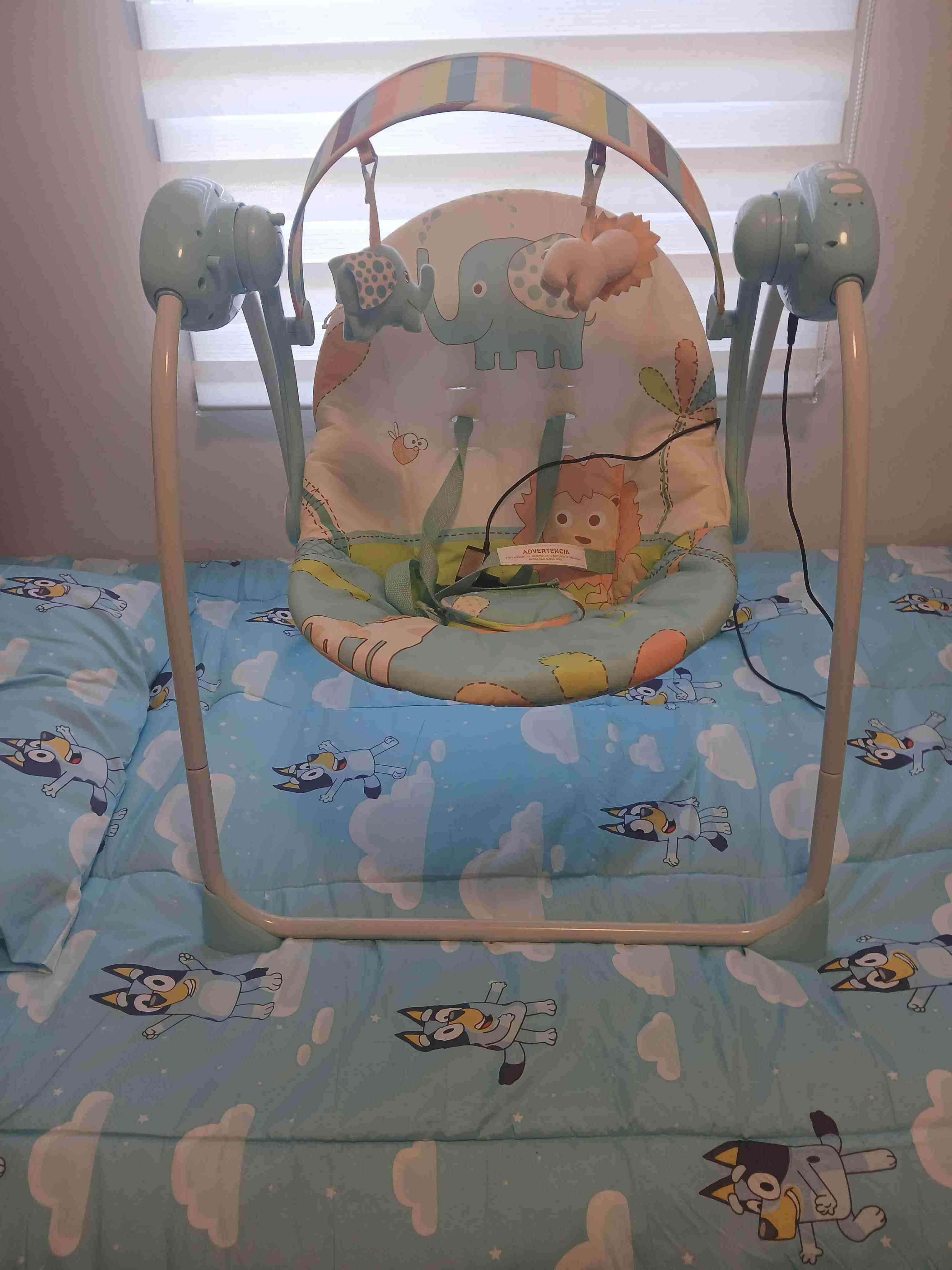 Columpio para bebé con diseño de elefantes y arco de juguetes. En buen estado para uso diario.