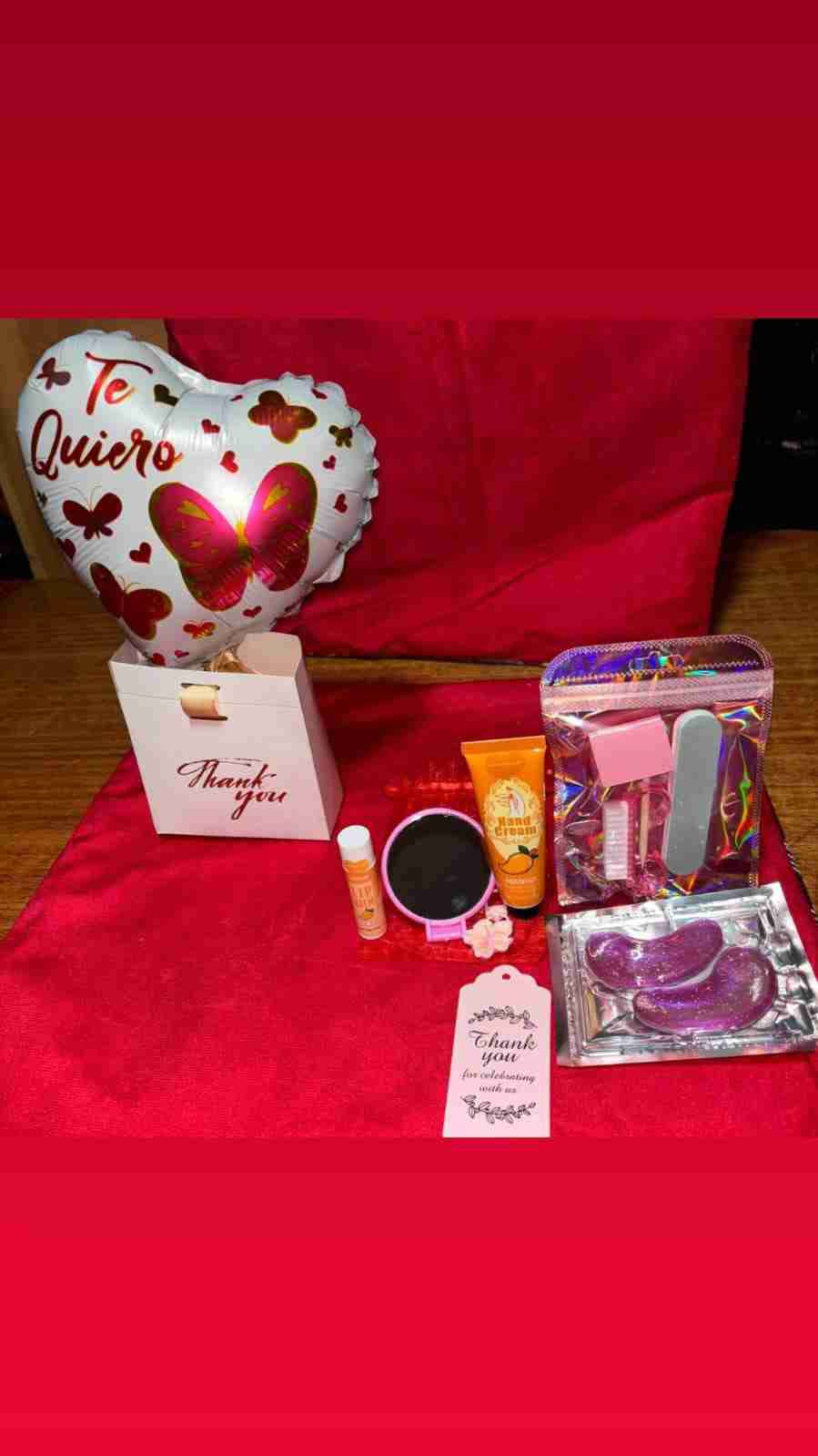 Incluye globo de 'Te quiero' y varios cosméticos en empaque. Ideal para un regalo especial. Buen estado general.