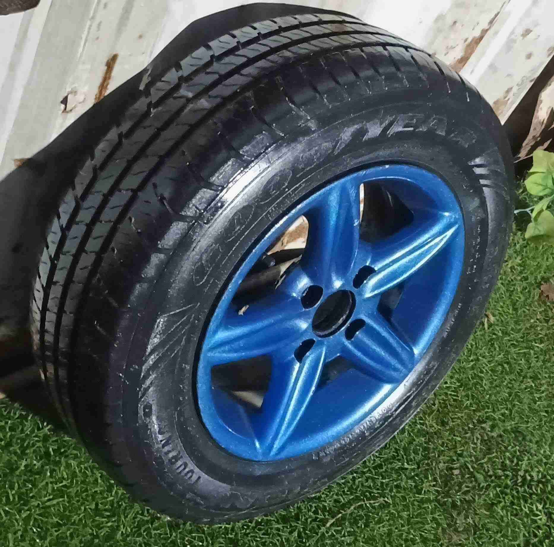 4 Llantas de auto en buen estado,color azul con neumáticos vida útil en un 80% Aro 13 Medida de apernadura 4x100