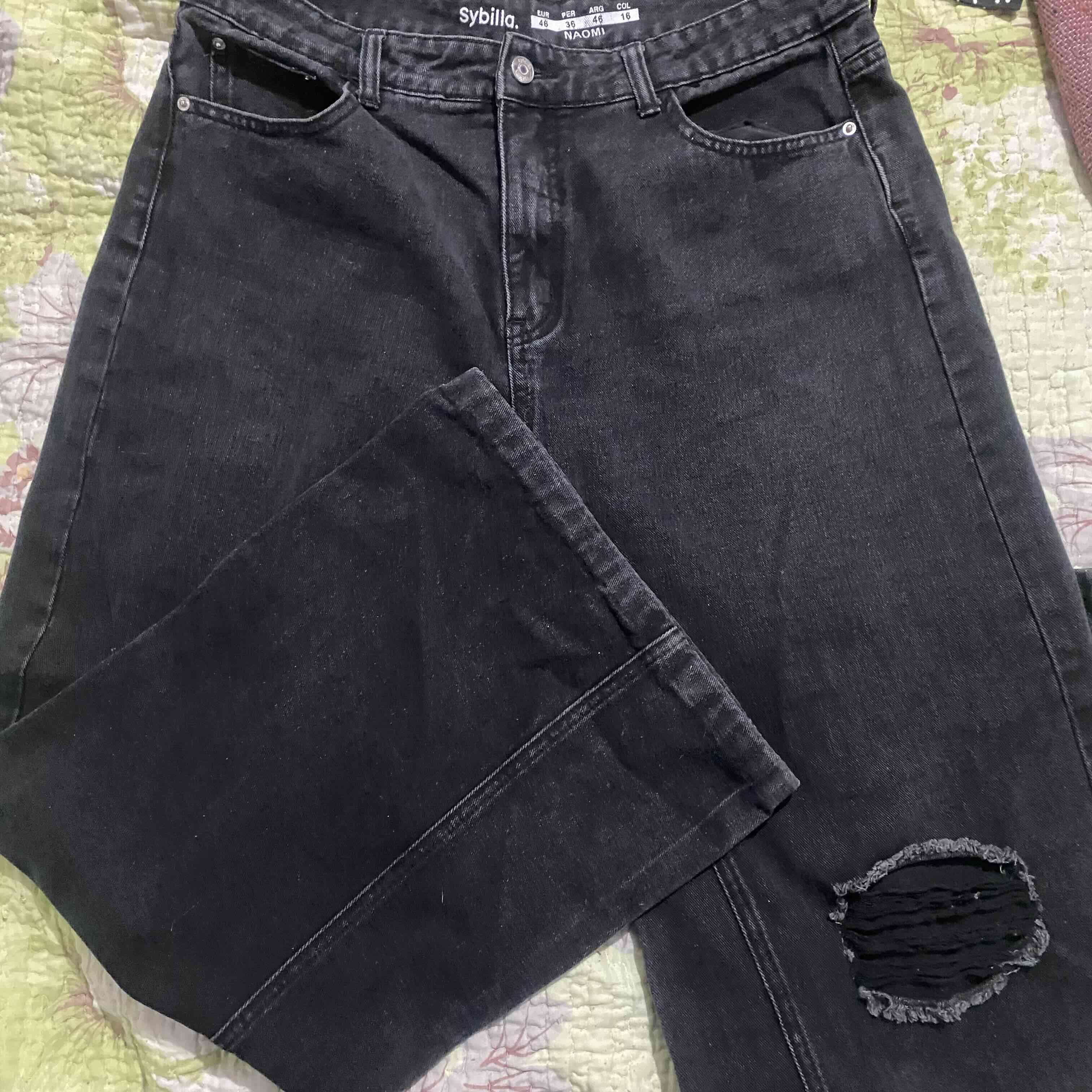 Jeans negros de la marca Sybilla, diseño desgastado. Perfectos para un look casual y moderno.
