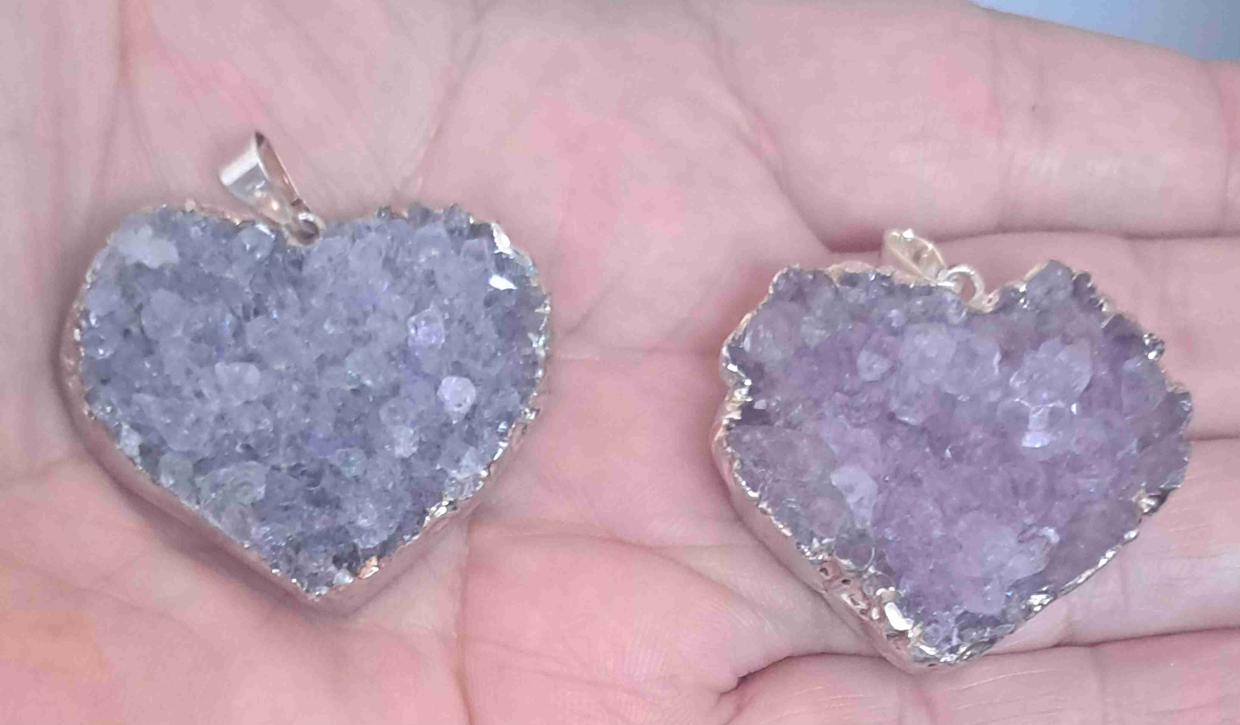 Hermosos colgantes de cuarzo amatista legitima en bruto, forma de corazón, en plata. Ideales para uso diario o como regalo especial. Excelente estado. $ 8.500 cada uno.