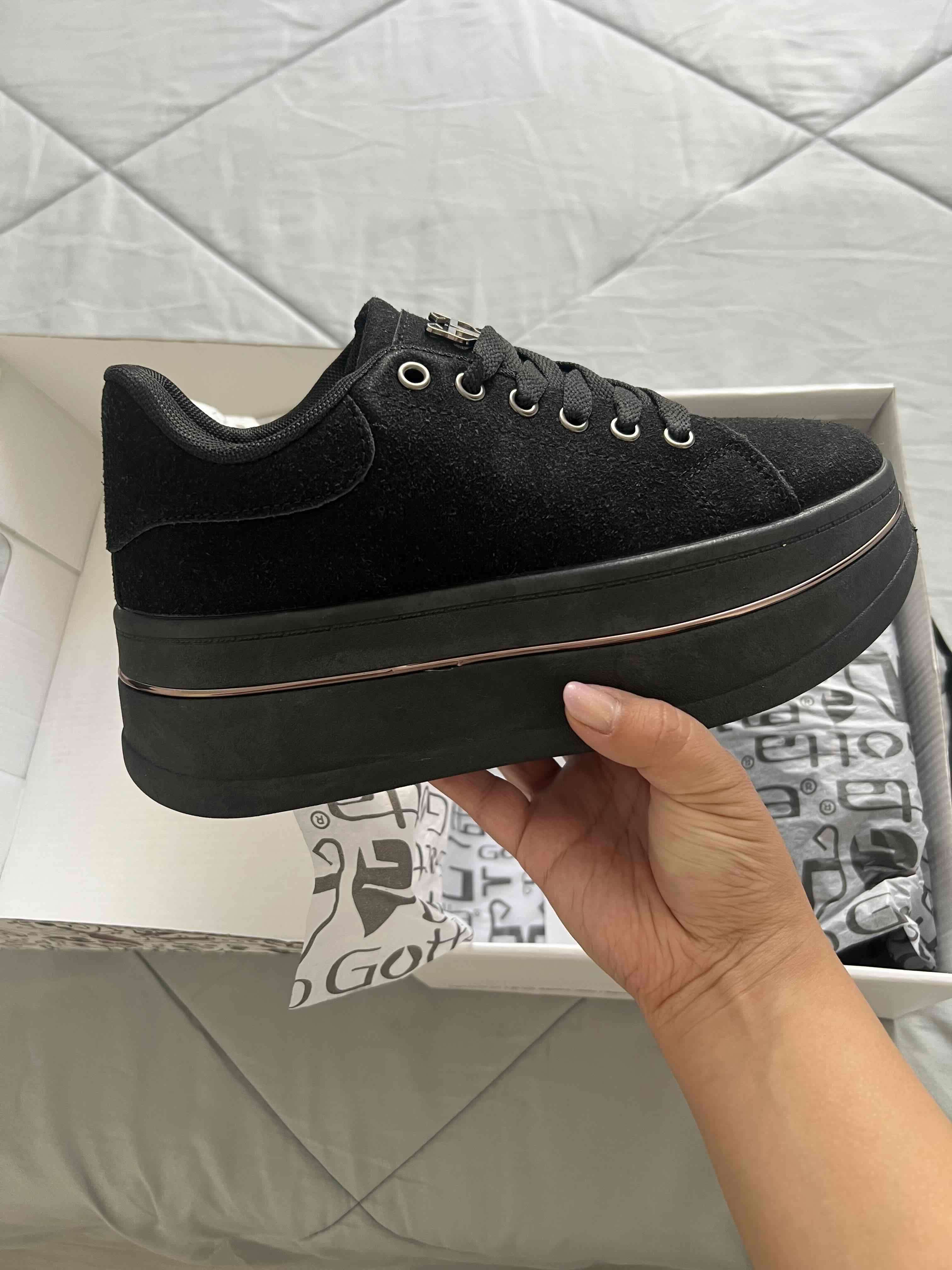 Zapatilla negra con plataforma alta, perfecta para un look moderno. En excelente estado.