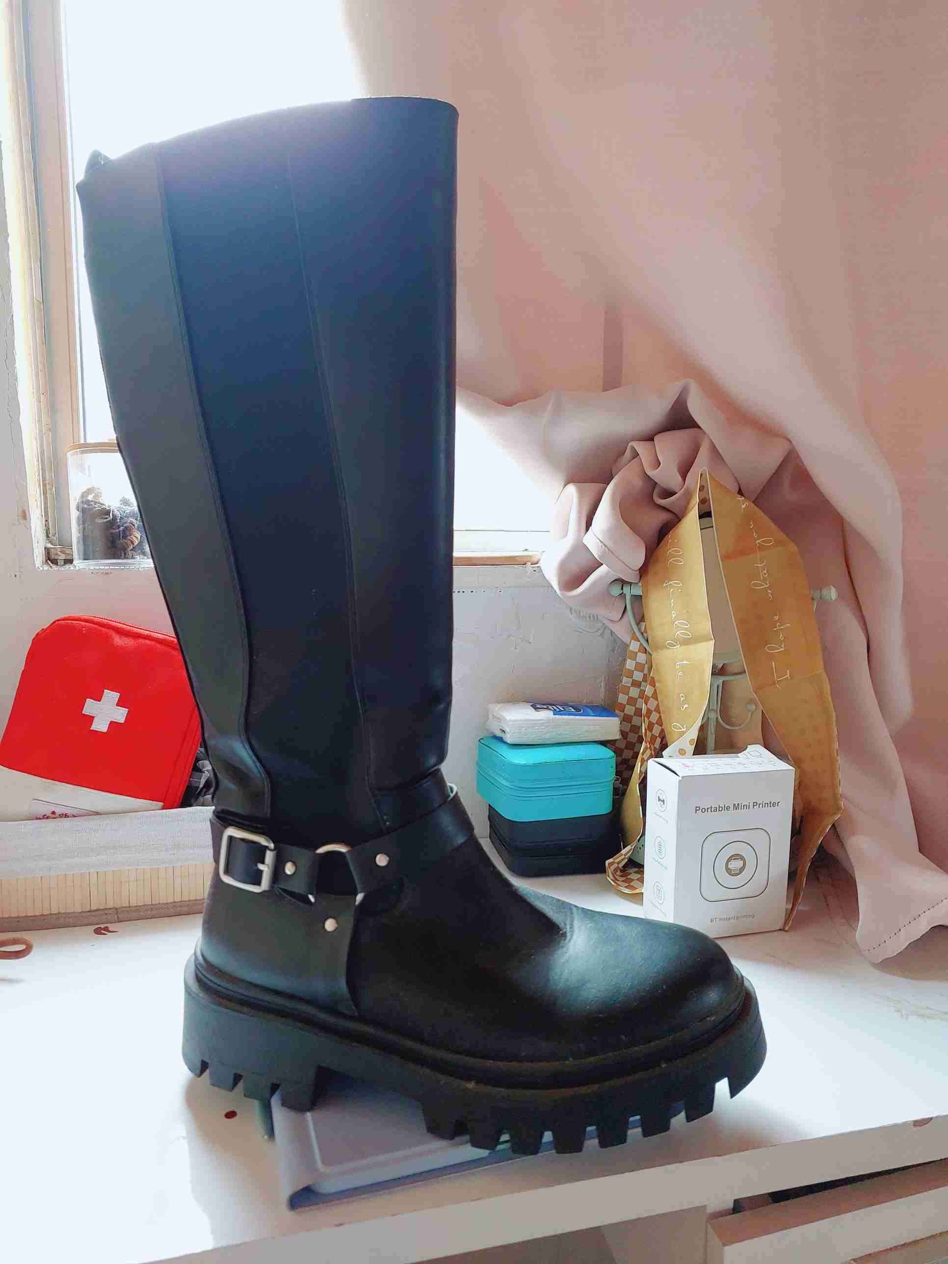 Bota estilo militar de cuero negro con suela gruesa y hebilla ajustable. Ideal para días fríos, en buen estado.