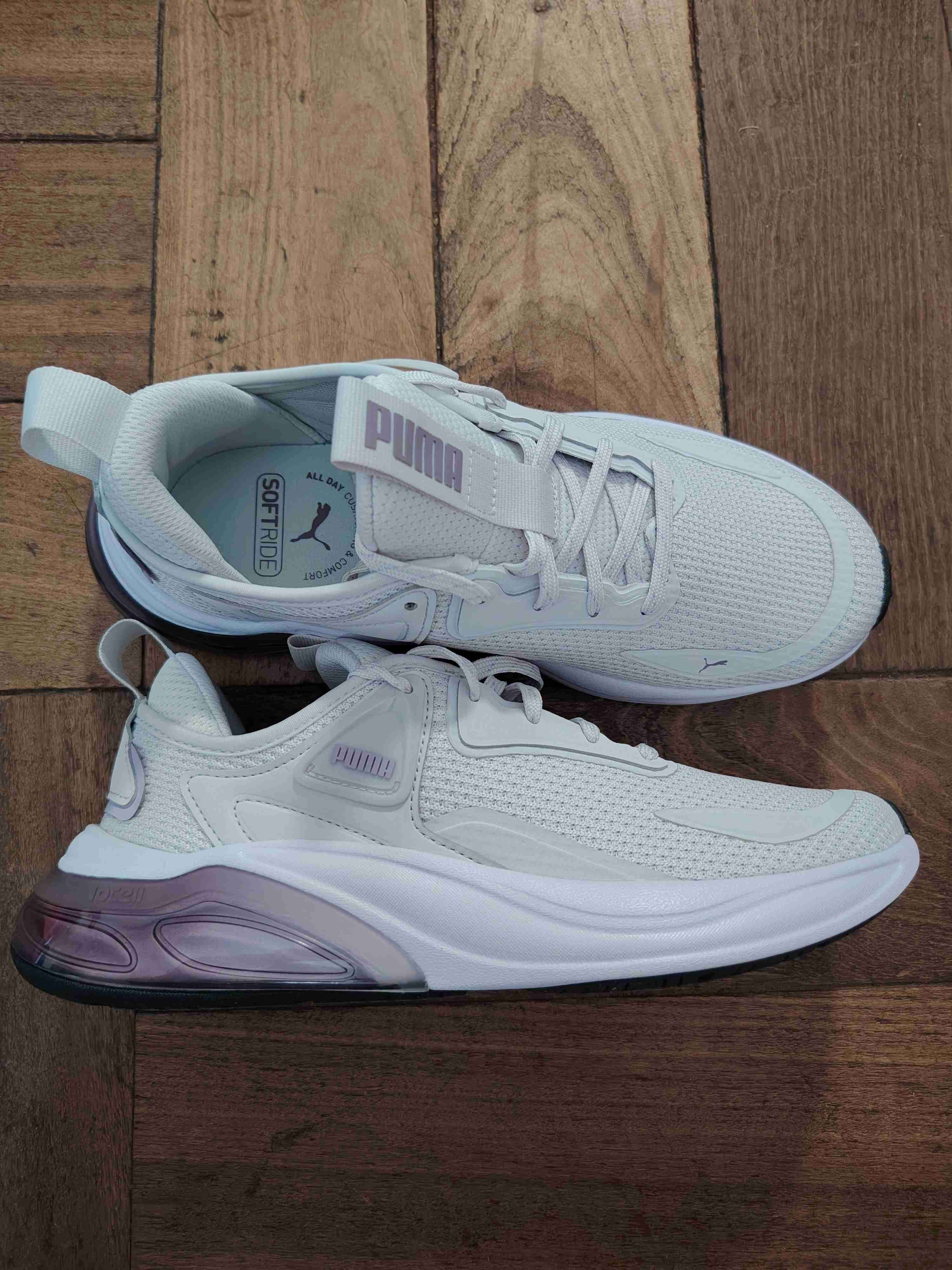 Zapatillas deportivas blancas con detalles lilas, ideales para entrenamiento. En buen estado, ligeramente usadas. Talla 37-38