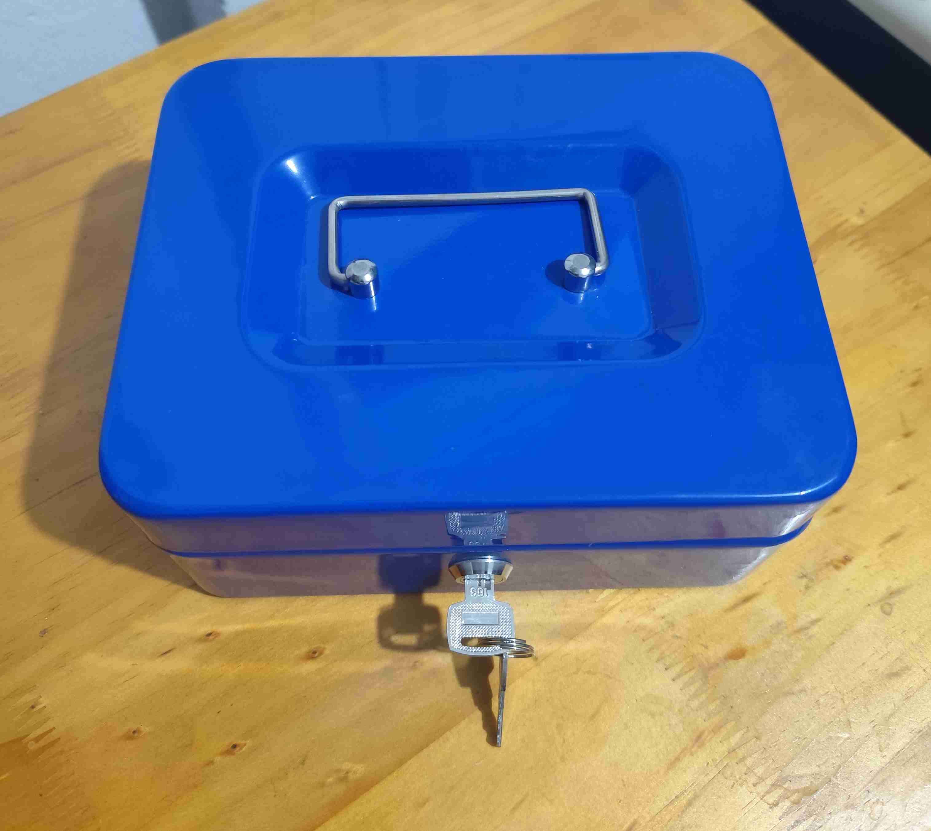 Caja metálica de seguridad, color azul, ideal para guardar dinero o documentos importantes. Viene con llave y está en buen estado.