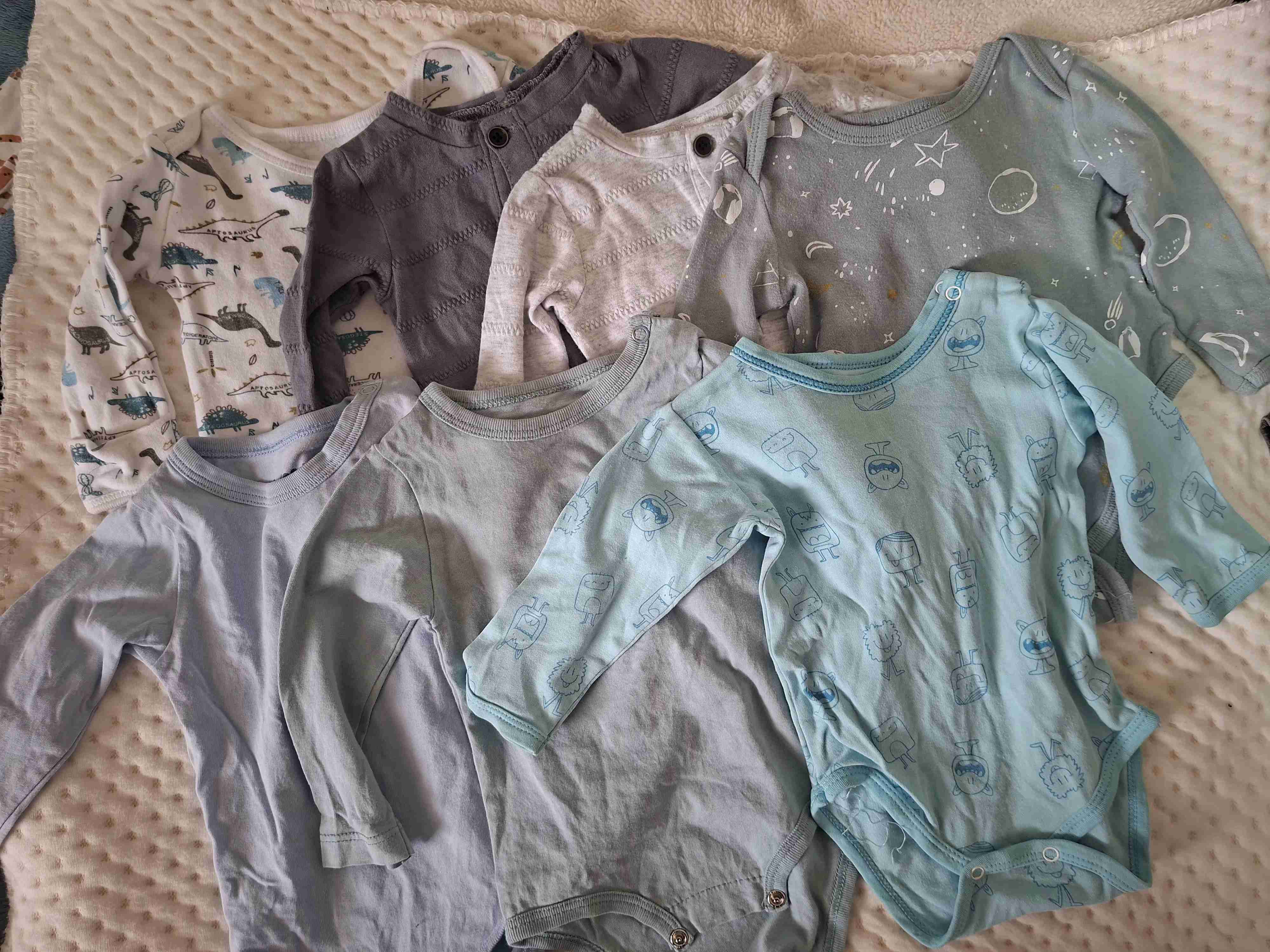 Conjunto de bodies de manga larga para bebé, con estampados infantiles. En buen estado, ideales para el uso diario. (7 unidades) desde los 3 meses a 9 meses