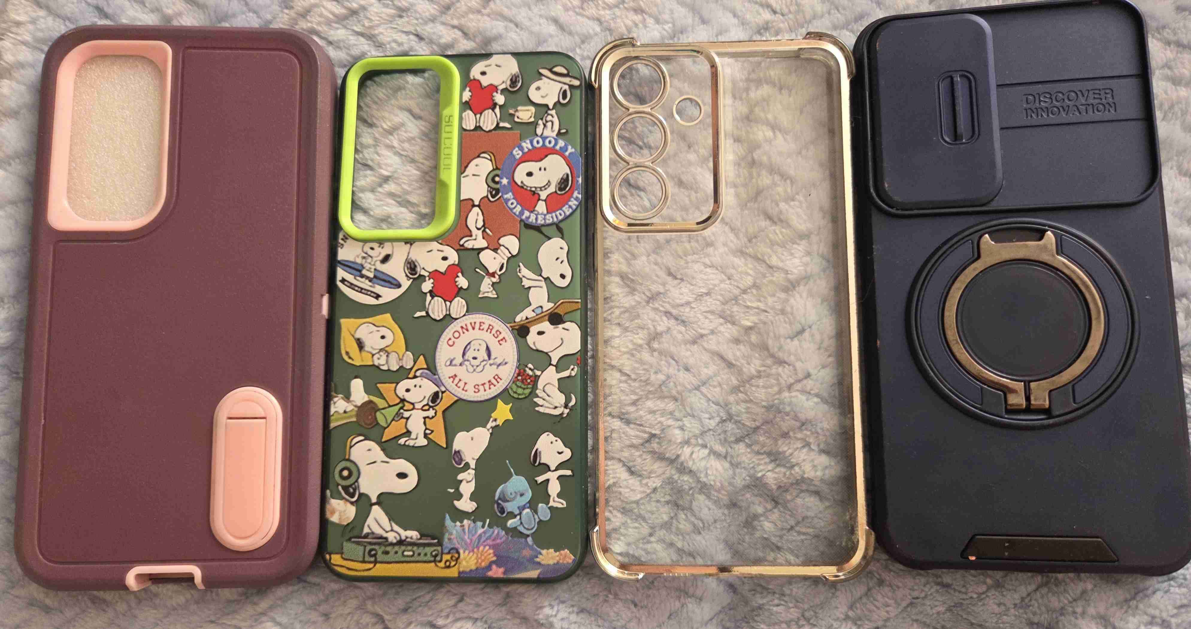 Conjunto de fundas para celular en diversos estilos, incluyendo diseño de Snoopy. Ideal para protección diaria con toque personalizado.