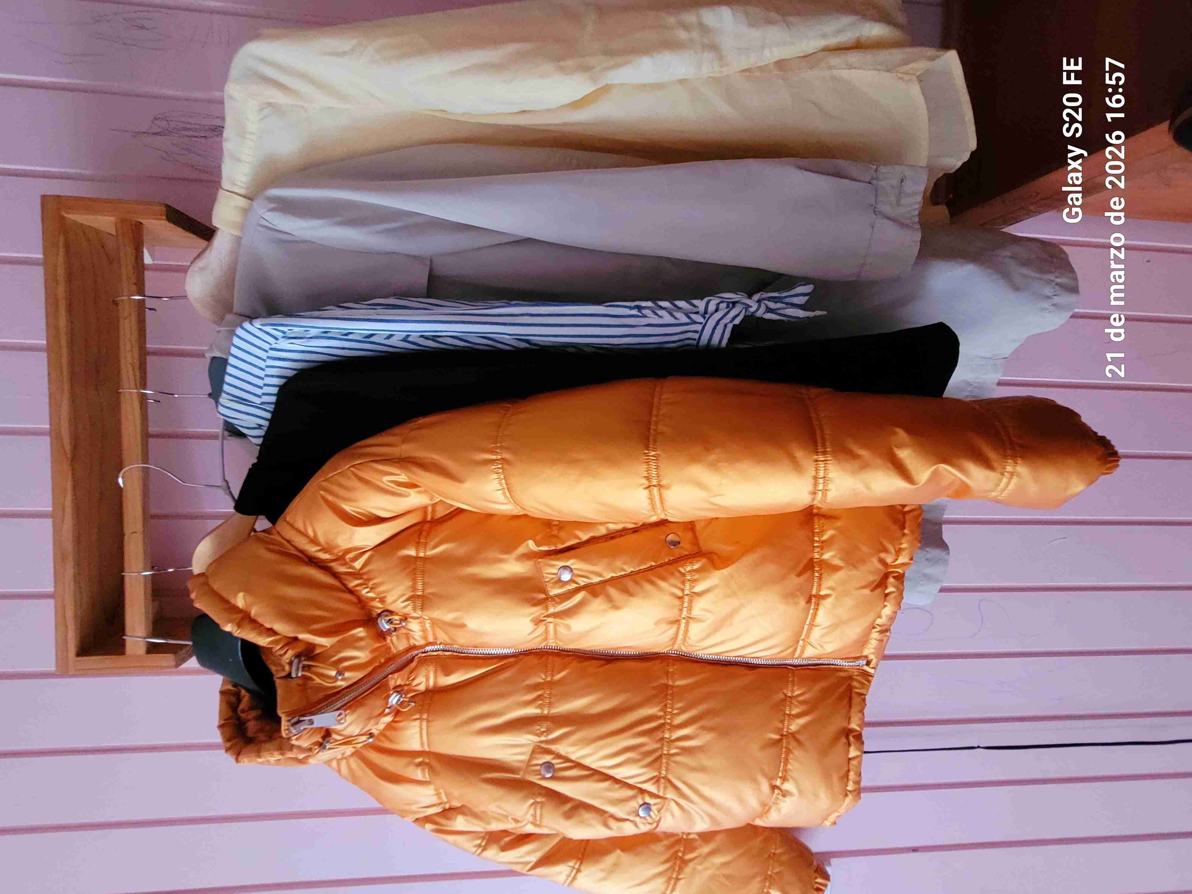 Lote contiene *Chaqueta acolchada color vibrante y abrigadora, ideal para el invierno. Talla S *Blusa verde talla S *Sweter gris talla S *Blusa amarillo pastel talla S *Trench beige talla S *Blusa con rayas talla S