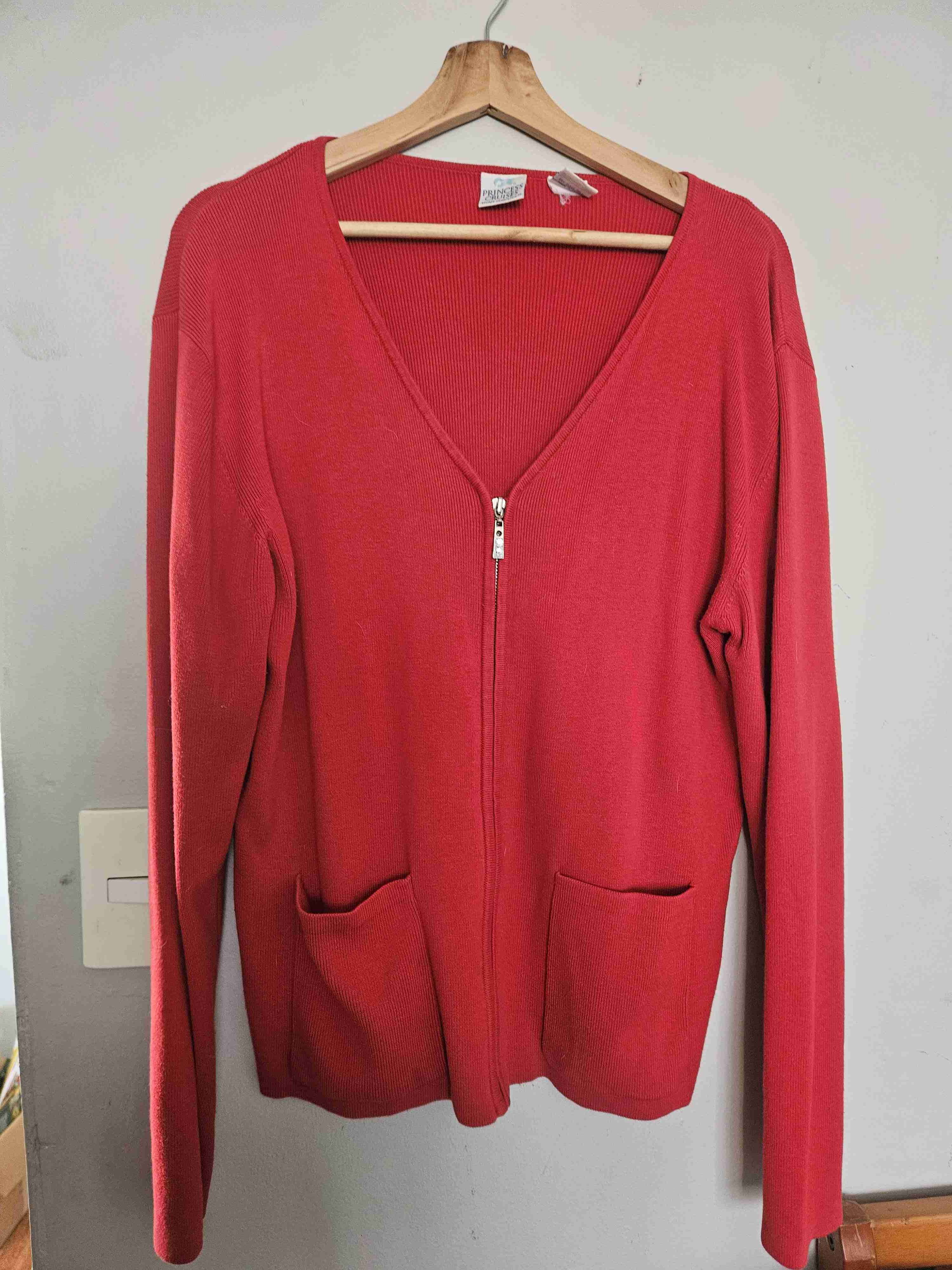 Chaleco de mujer color rojo con cierre frontal y bolsillos, ideal para el día a día. Estado en buen estado general con leves signos de uso. Jardinera negra botones en los costados, sin uso. Camisa lineas azul y blanco, tela delgada. Chaleco Amarillo de lana, liviano Chaqueta negra larga, sin uso.