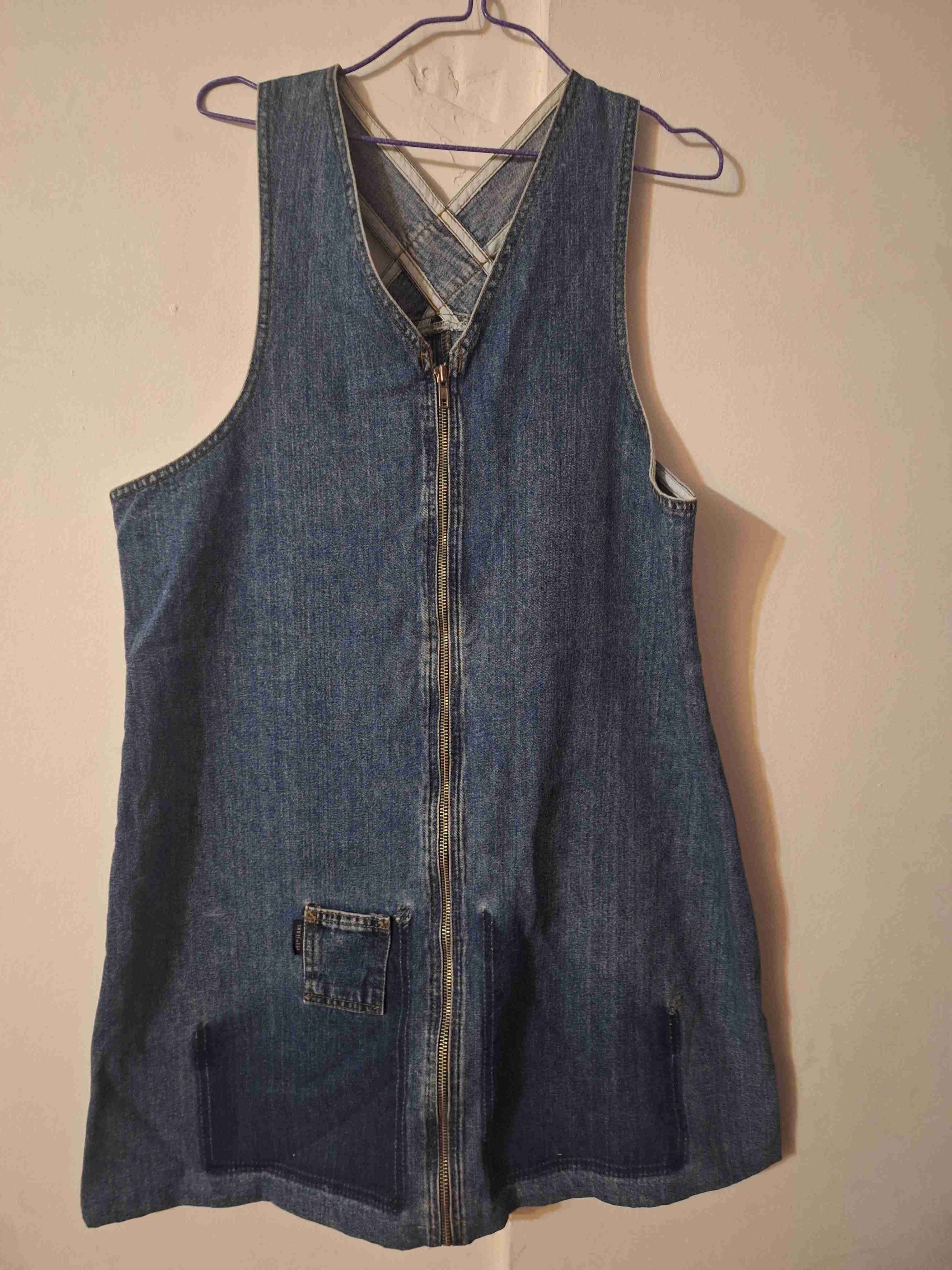 Chaleco de mezclilla azul con cierre delantero. Ideal para un look casual y cómodo. En buen estado, con leves signos de uso.