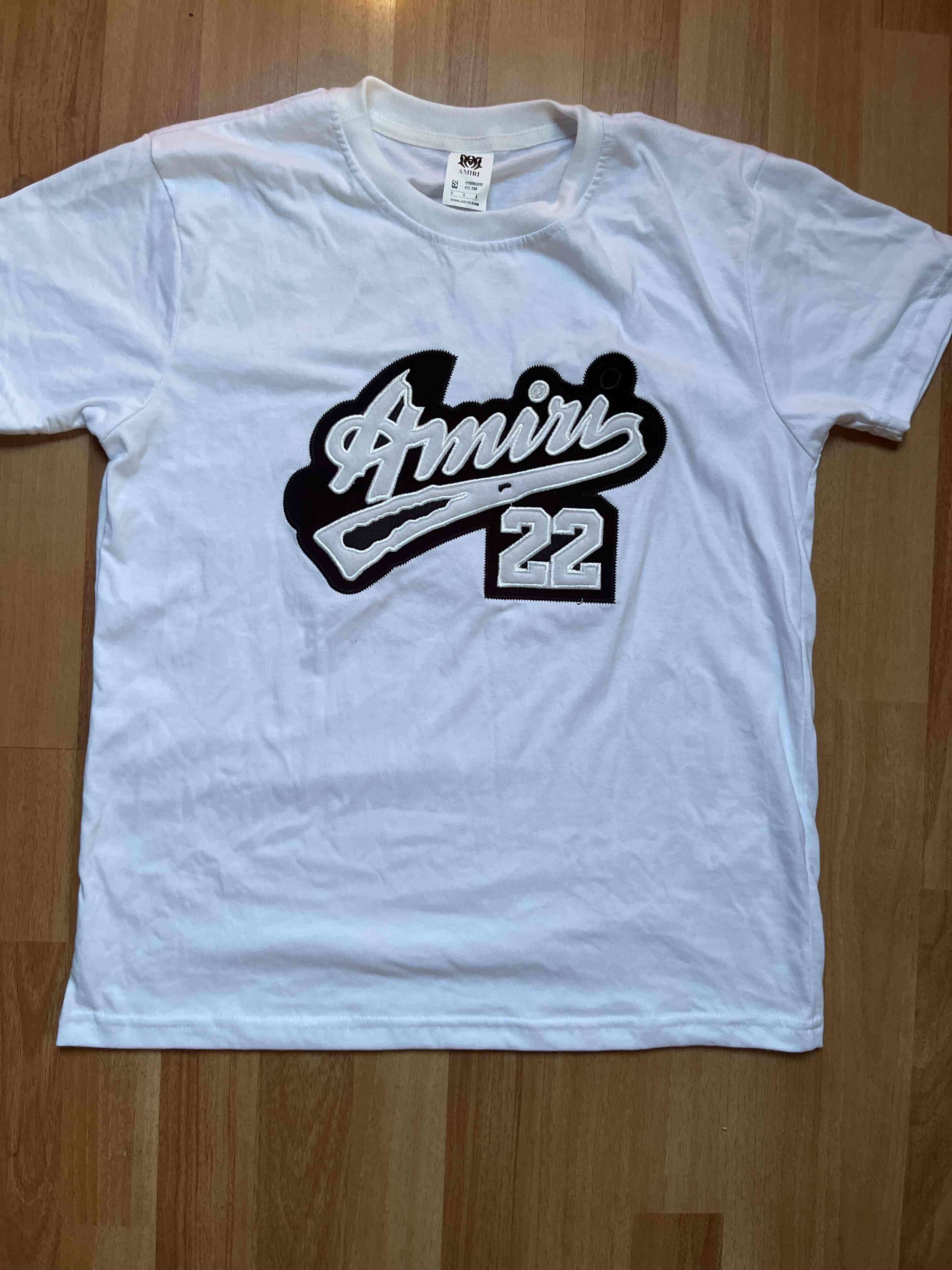 Polera blanca con diseño Amiri 22 en buen estado, ideal para uso casual. Talla S, No Original. Precio conversable, Se entrega limpia y planchada