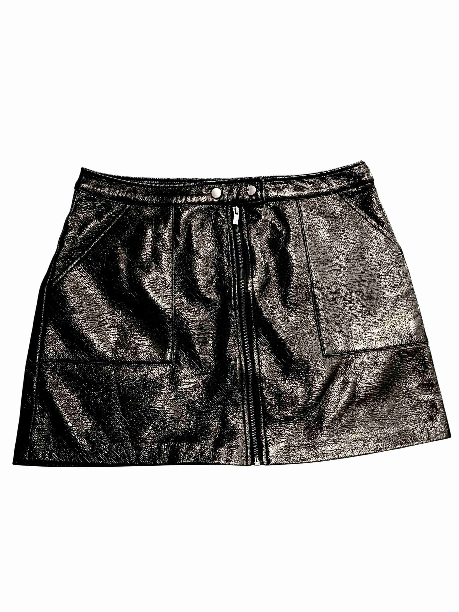 Falda corta negra talla L con acabado brillante, con bolsillos, cierre central y boton broche para mayor comodidad. Ideal para salidas nocturnas. En buen estado.