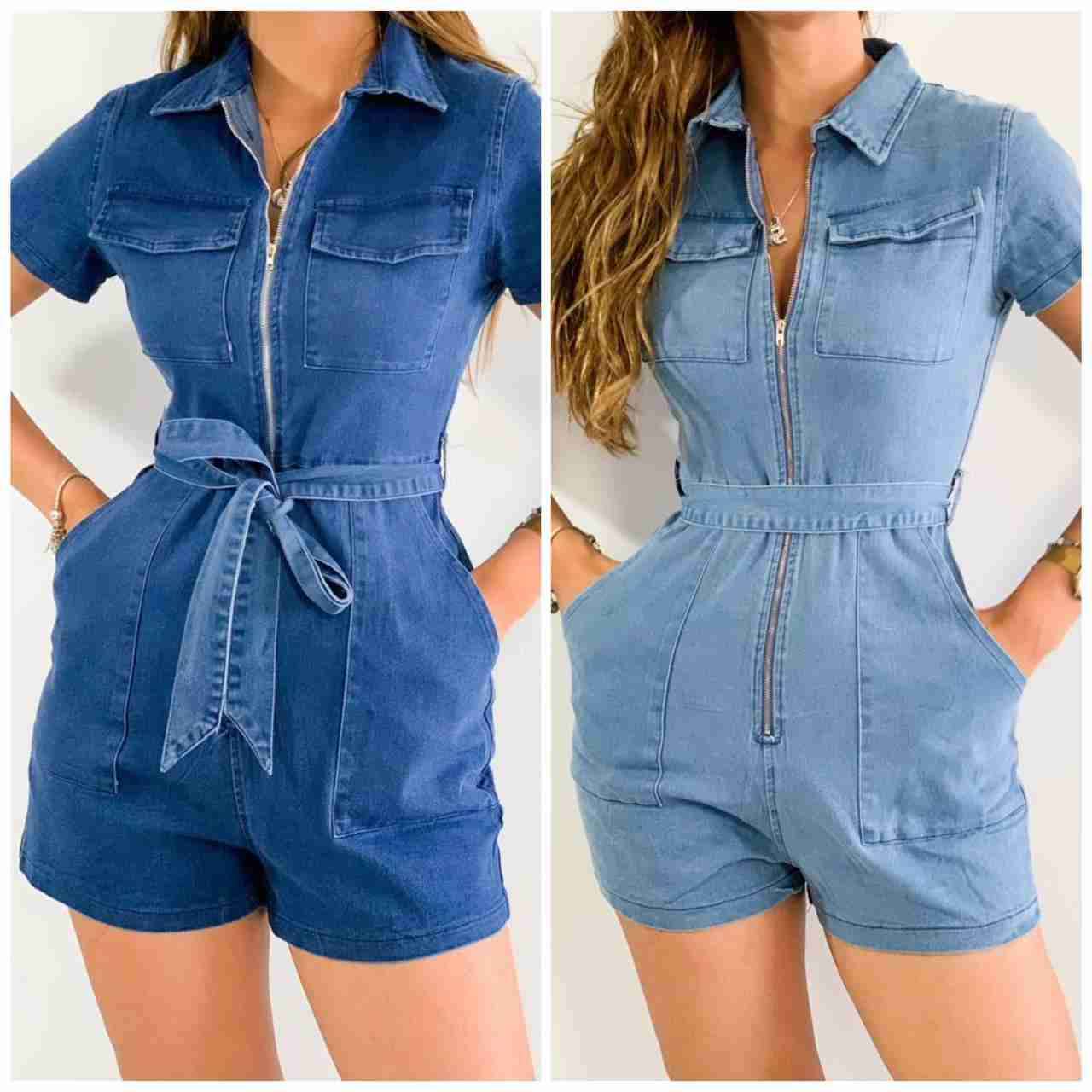 Elegante enterito de mezclilla con cierre delantero y lazo ajustable. Perfecto para un look casual.