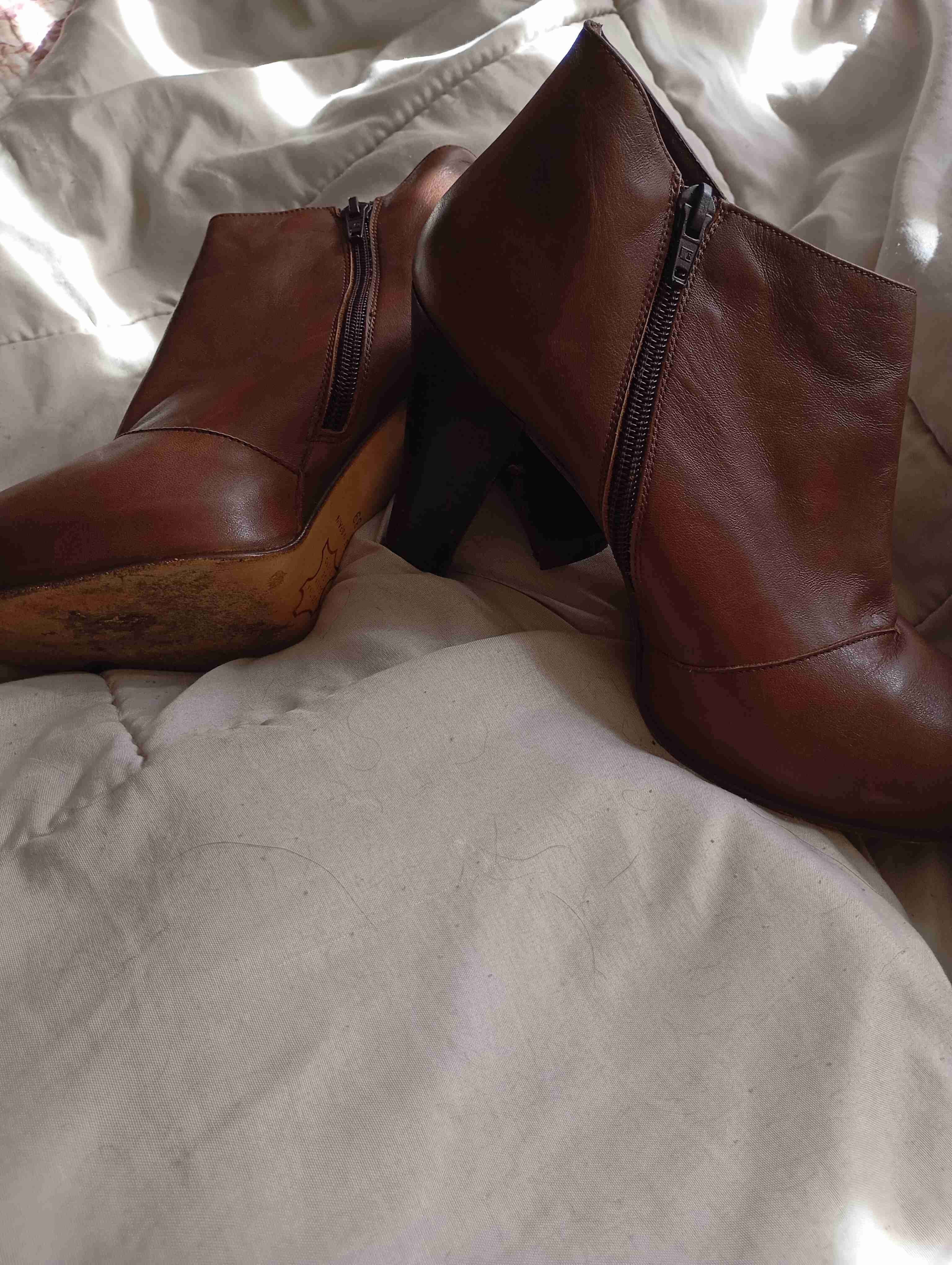 Elegantes botines de cuero marrón, cierre lateral. En buen estado con uso visible en la suela.