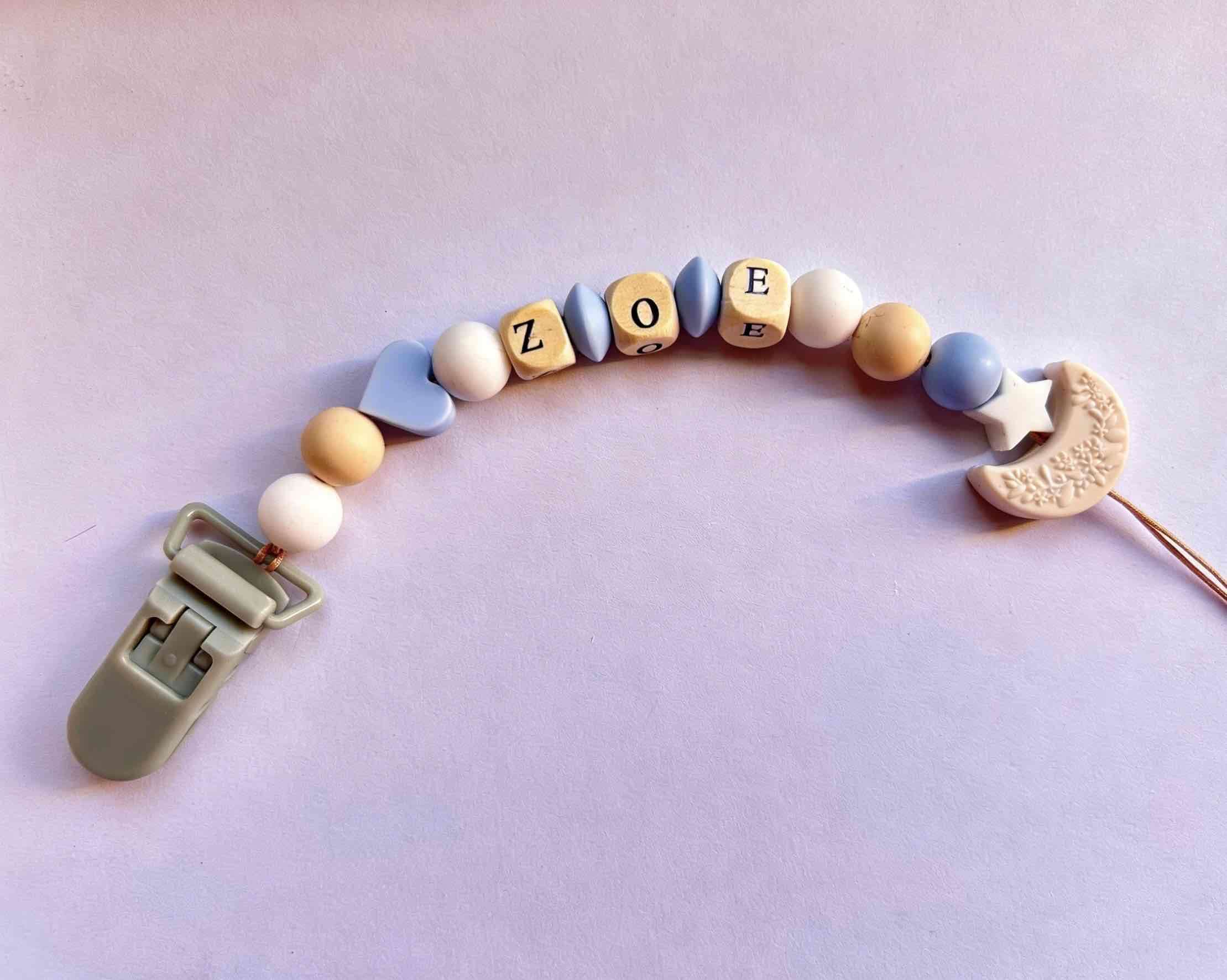 Hermoso porta chupetes personalizado, hecho con letras y cuentas de madera natural. Ideal para poner los dos nombres del bebé. 🪵🧸 ✅ Nombres grabados en madera (NO silicona) ✅ Diseño elegante, fino y muy resistente ✅ Materiales de primera calidad y seguros ✅ Clip de seguridad que no daña la ropa Se ve precioso y es un detalle súper original. ¡Escríbeme y dime qué nombres quieres que lleve! 📩